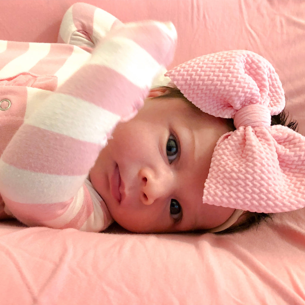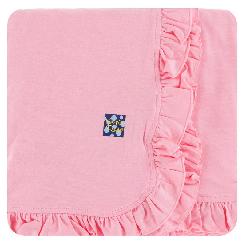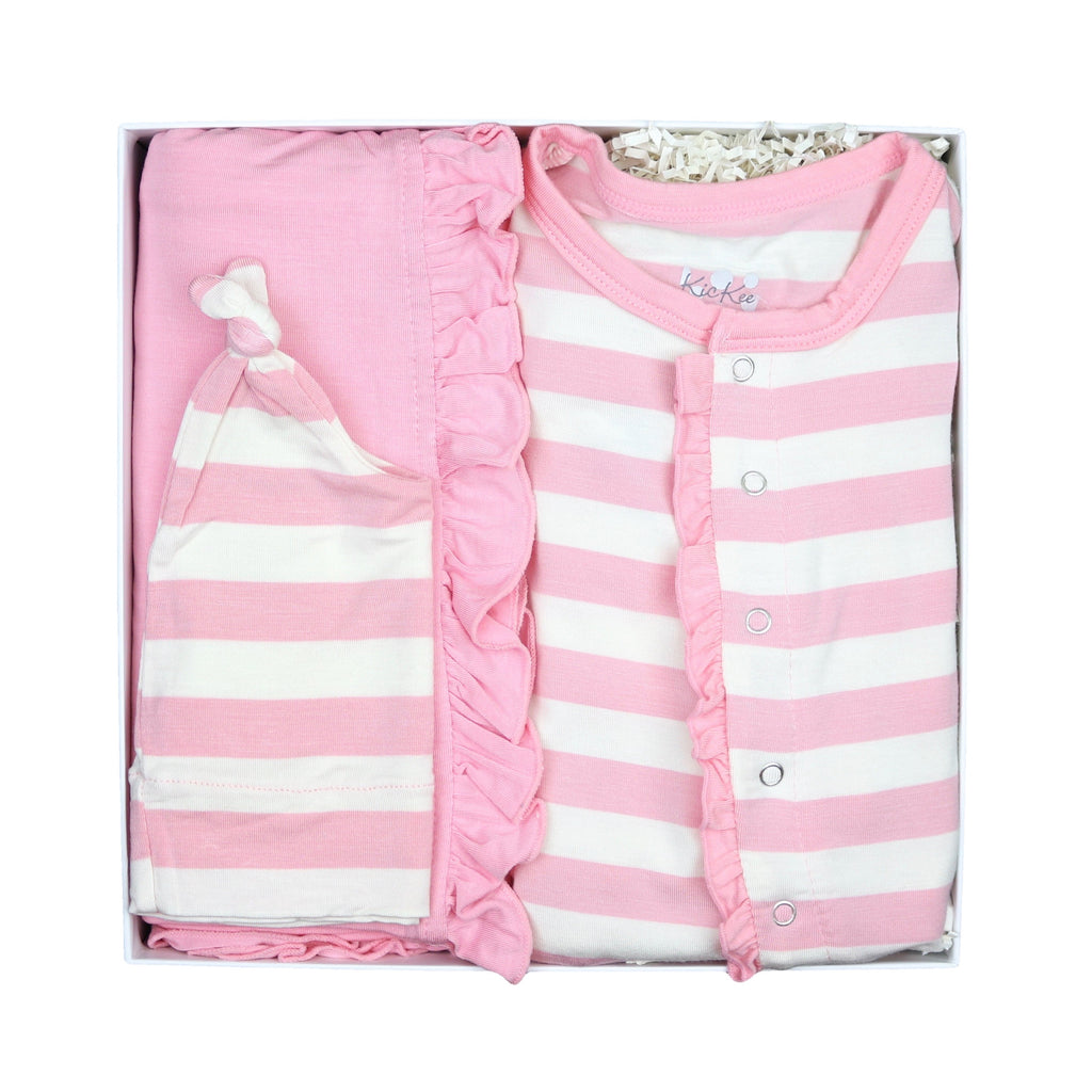 Bring baby home in this classic, beautiful and high-quality all-bamboo outfit by Kickee Pants. This new baby gift is the softest you will find and is ultra gentle on your newborn baby's extremely delicate skin. Once you put your little one in this high-quality bamboo clothing, you won't want to put them in anything else! This new baby girl gift features Ruffle Footie with Snaps in Lotus Stripe, Ruffle Stroller Blanket in Lotus pink, and Double Knot Hat in your choice of Lotus Stripe or solid Lotus pink by Kickee Pants.