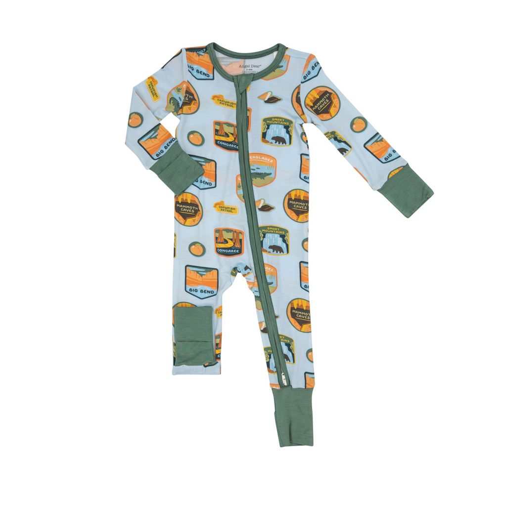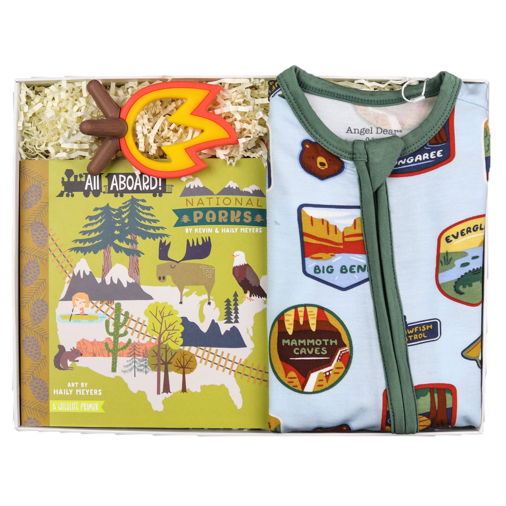 Featuring bamboo zipper romper in Southeast National Park Patches by Angel Dear, Little Camper Campfire Teether by Lucy Darling and All Aboard National Parks book by BabyLit.
