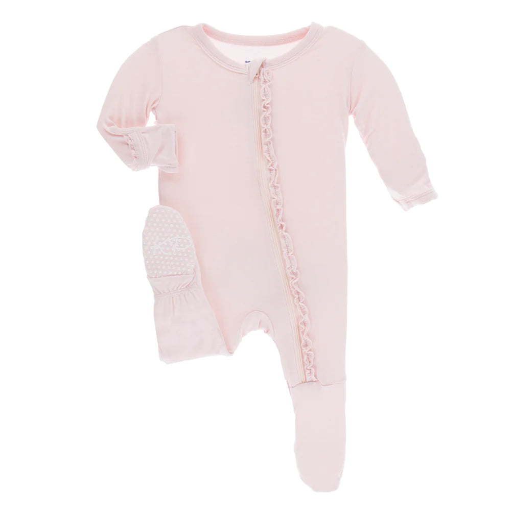 - Footie is made of 95% Viscose from Bamboo, 5% Spandex. Footie features ruffles on the butt, down the front and on the flip of the paw for an extra feminine look. Flip paws cover cold hands and prevent scratching. The inside of each foot is lined with soft fleece and the outside bottom is embroidered to prevent slipping. SPF 50+. KicKee Pants uses only source bamboo that is grown organically from manufacturers that provide Harmful Chemical Free Assurance.