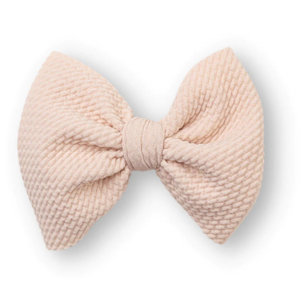 - Bow is one-size-fits-all from newborn to toddler. 4” bow on stretchy nude nylon headband.