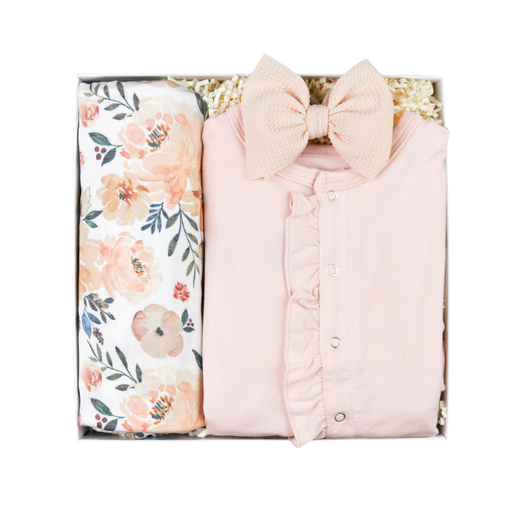 The sweetest homecoming gift or newborn photo outfit, featuring a soft pink, peach and beige color palette and beautiful feminine detail in the ruffles and floral swaddle. Includes a muffin ruffle footie in macaroon by Kickee Pants, knit swaddle blanket in Autumn by Copper Pearl, and Skinny Bow in Rosie by Little Lopers.