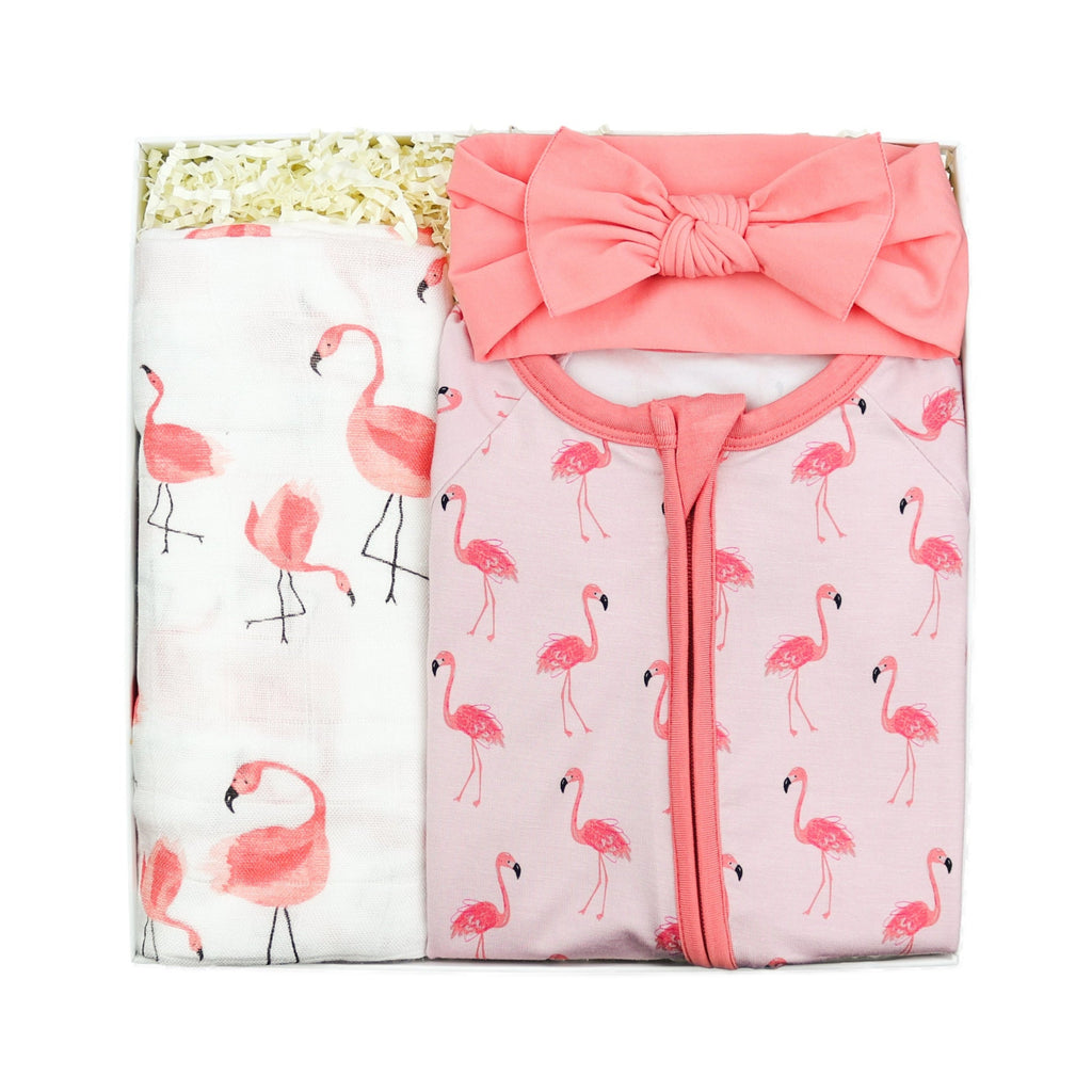 A pretty-in-pink flamingo set for a sweet baby girl, featuring bamboo zipper pajama in Fancy Flamingos by Emerson and Friends, deluxe muslin swaddle in Pink Ladies by Little Unicorn, and knot bow in Candyfloss by Little Bow Pip.