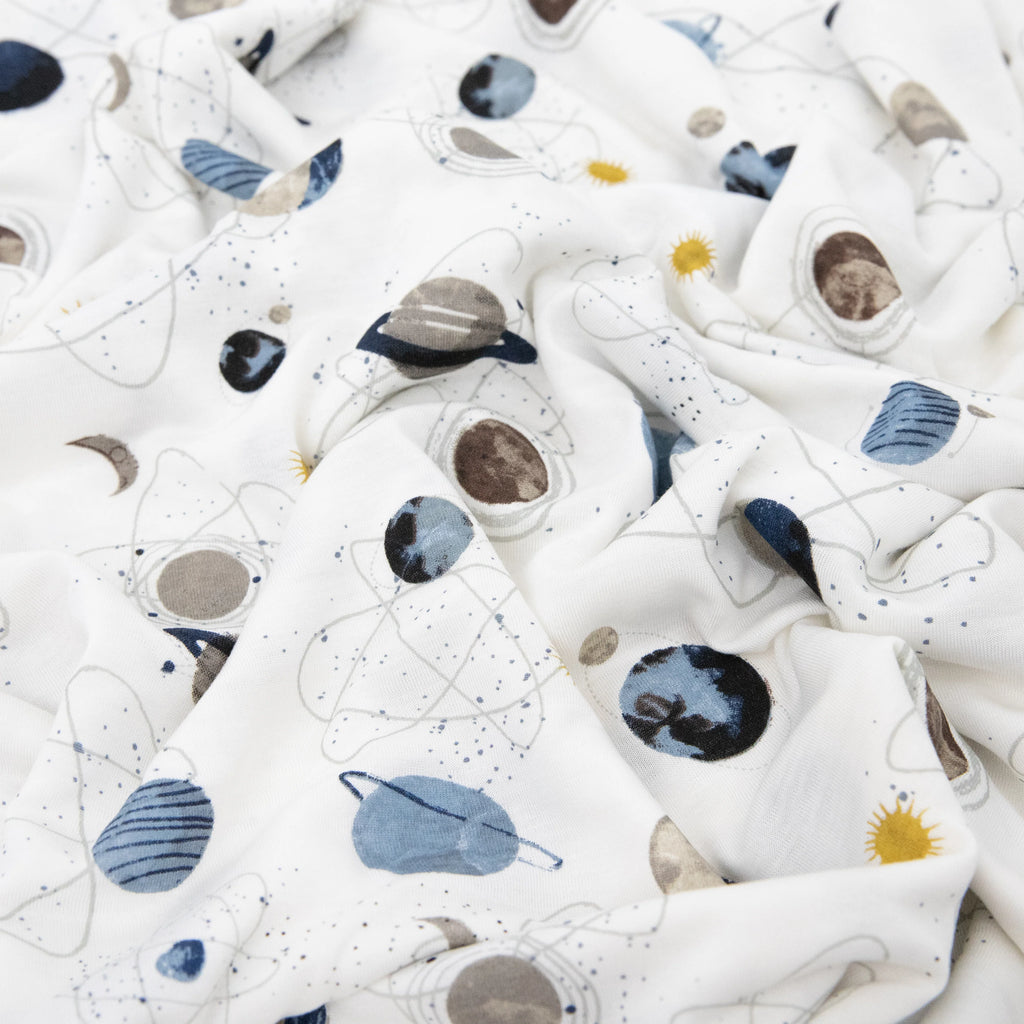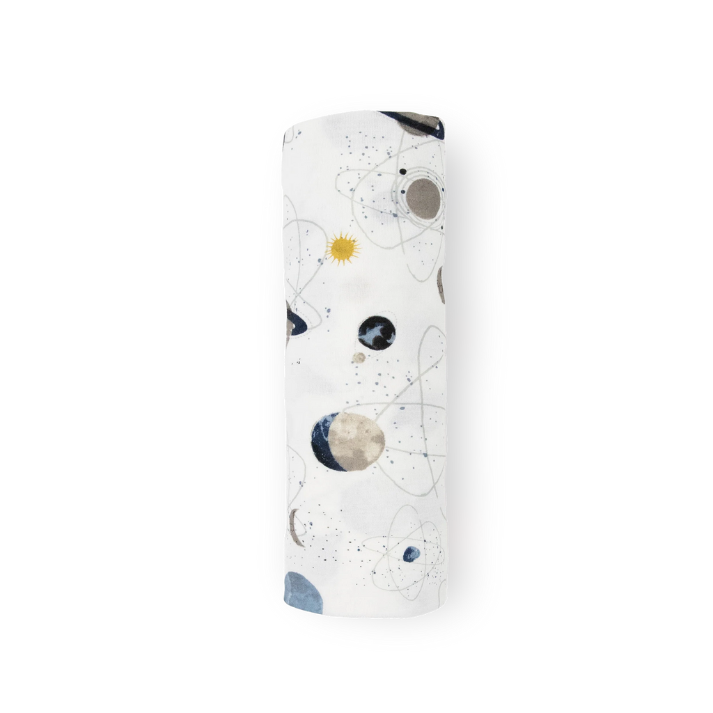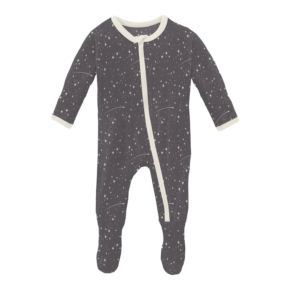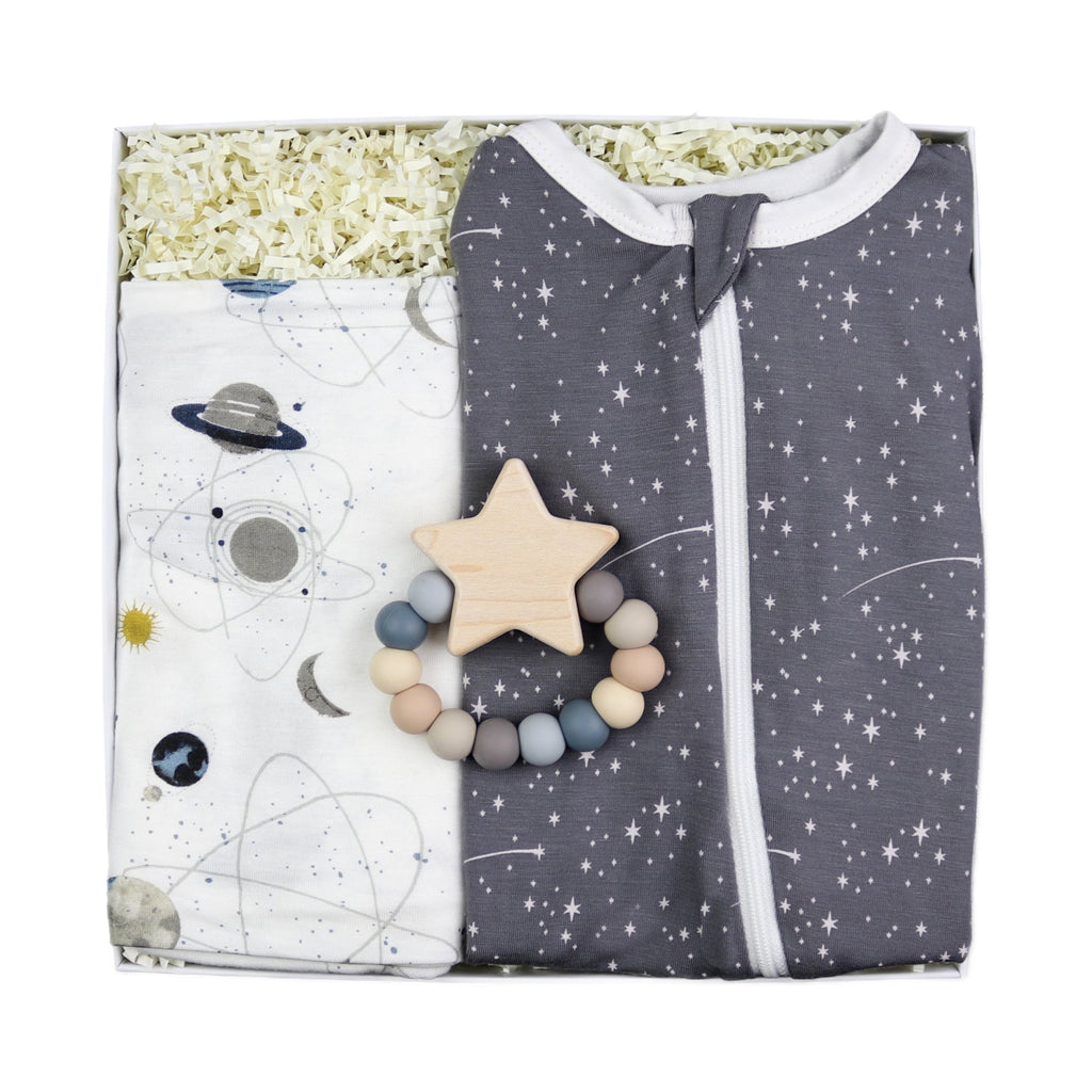 Featuring bamboo zipper footie in Rain Shooting Stars by Kickee Pants, stretch knit swaddle blanket in Planets by Little Unicorn and Star Charm Teether in Riverbed by Bannor Toys.