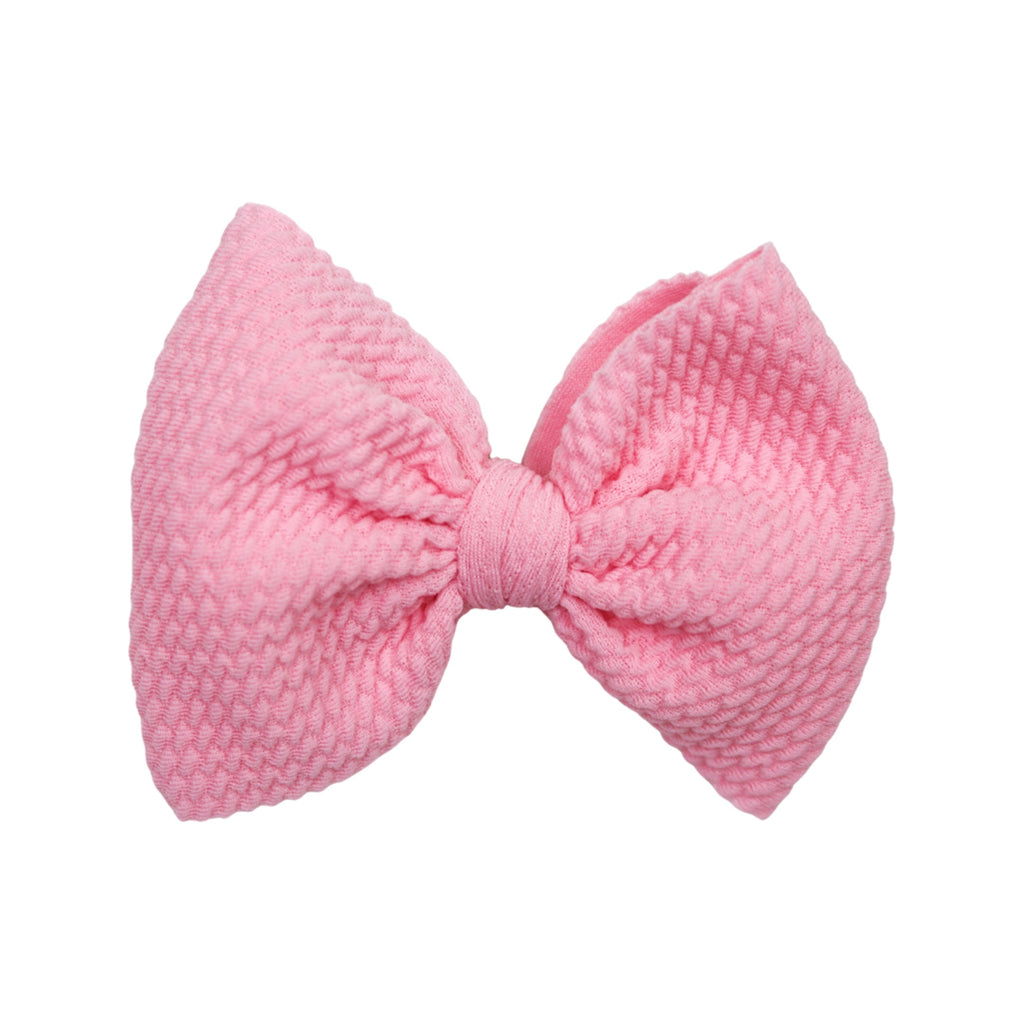 - Bows are one-size-fits-all from newborn to toddler. 4” bows on stretchy nude nylon headbands.