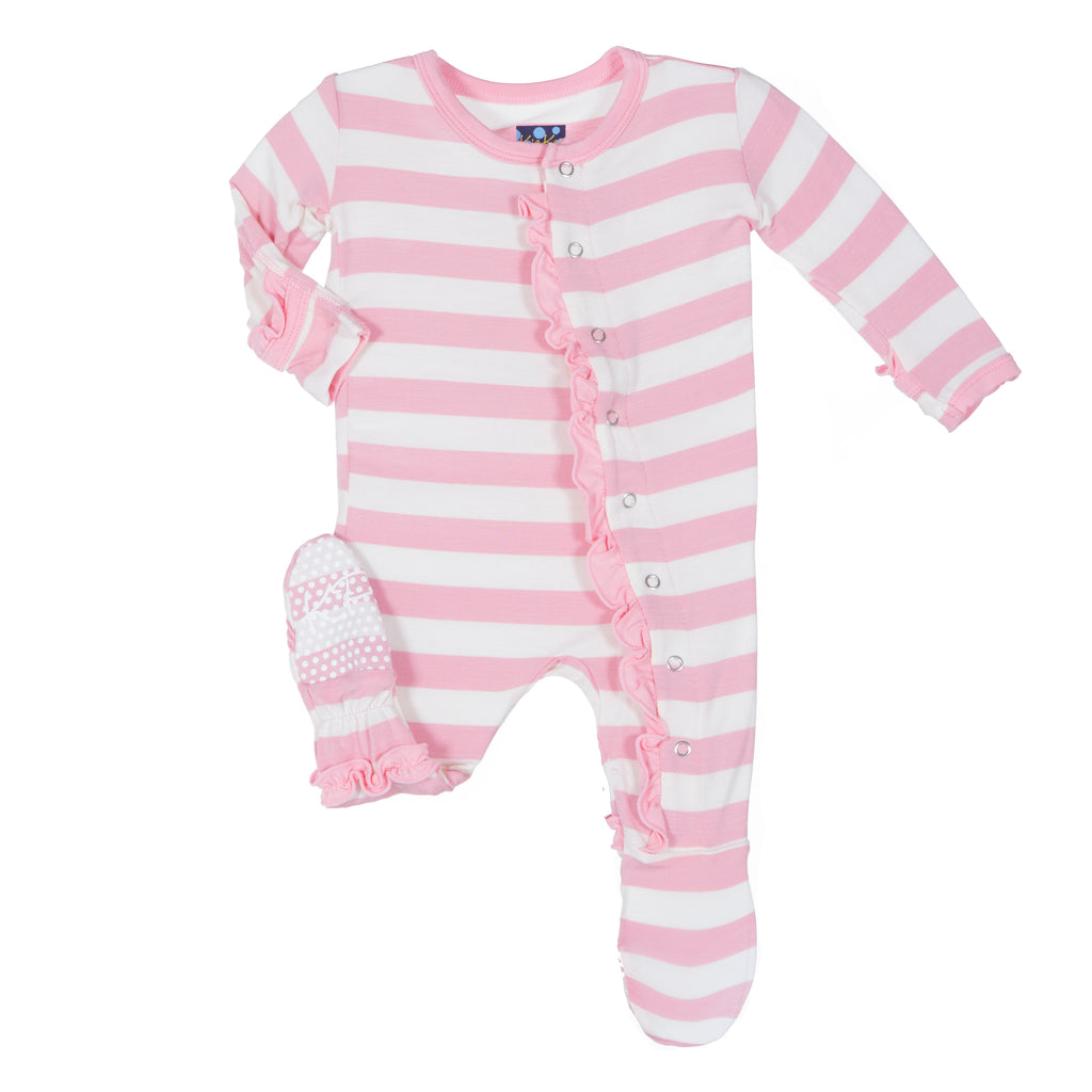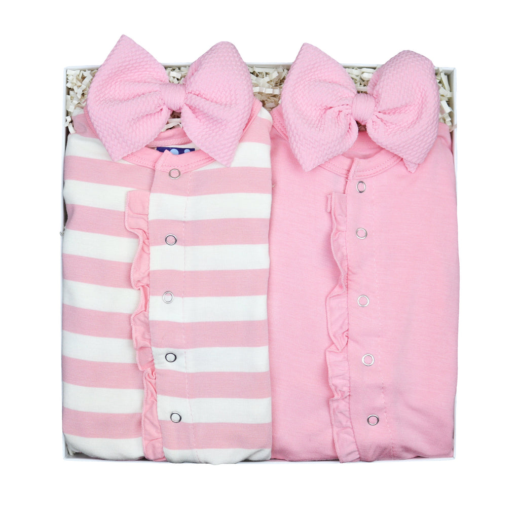 Welcome precious girl-girl twins into the world with this set featuring the softest premium bamboo footed jammies and coordinating pink bows! As a twin mom myself, I would have delighted in a high-quality set like this to take my twins home from the hospital in (and to put them in as much as possible). Featuring Classic Ruffle Footie with Snaps in Lotus Stripe and Classic Ruffle Footie with Snaps in solid Lotus by Kickee Pants, plus a matching set of two pink skinny bows on nude nylon by Little Lopers.