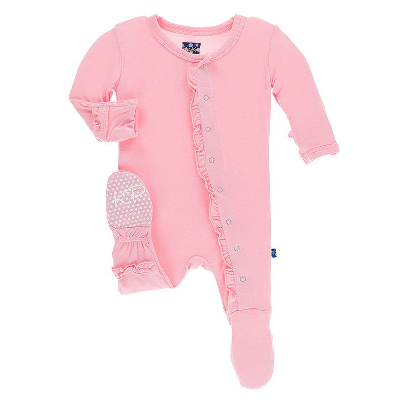 - Footies are made of 95% Viscose from Bamboo, 5% Spandex. Footies feature ruffles on the butt, down the front and on the flip of the paw for an extra feminine look. Flip paws cover cold hands and prevent scratching. The inside of each foot is lined with soft material and the outside bottom is embroidered to prevent slipping. SPF 50+. KicKee Pants uses only source bamboo that is grown organically from manufacturers that provide Harmful Chemical Free Assurance.