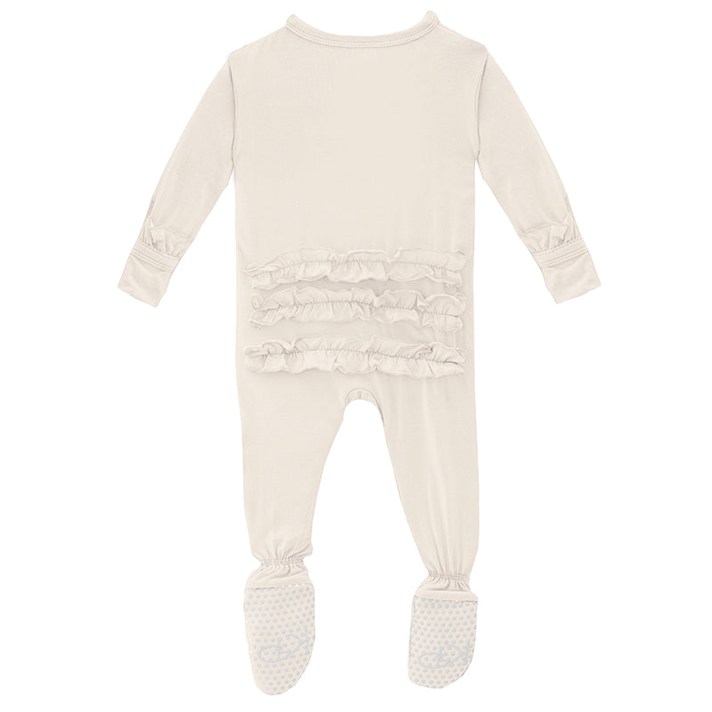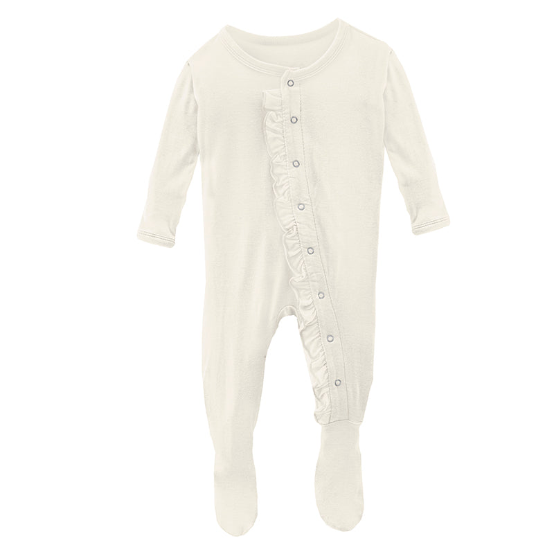 Made of 95% Viscose from Bamboo, 5% Spandex. Footie features ruffles on the butt, down the front and on the flip of the paw for an extra feminine look. Flip paws cover cold hands and prevent scratching. The inside of each foot is lined with soft fleece and the outside bottom is embroidered to prevent slipping. SPF 50+. KicKee Pants uses only source bamboo that is grown organically from manufacturers that provide Harmful Chemical Free Assurance. Snap closure.
