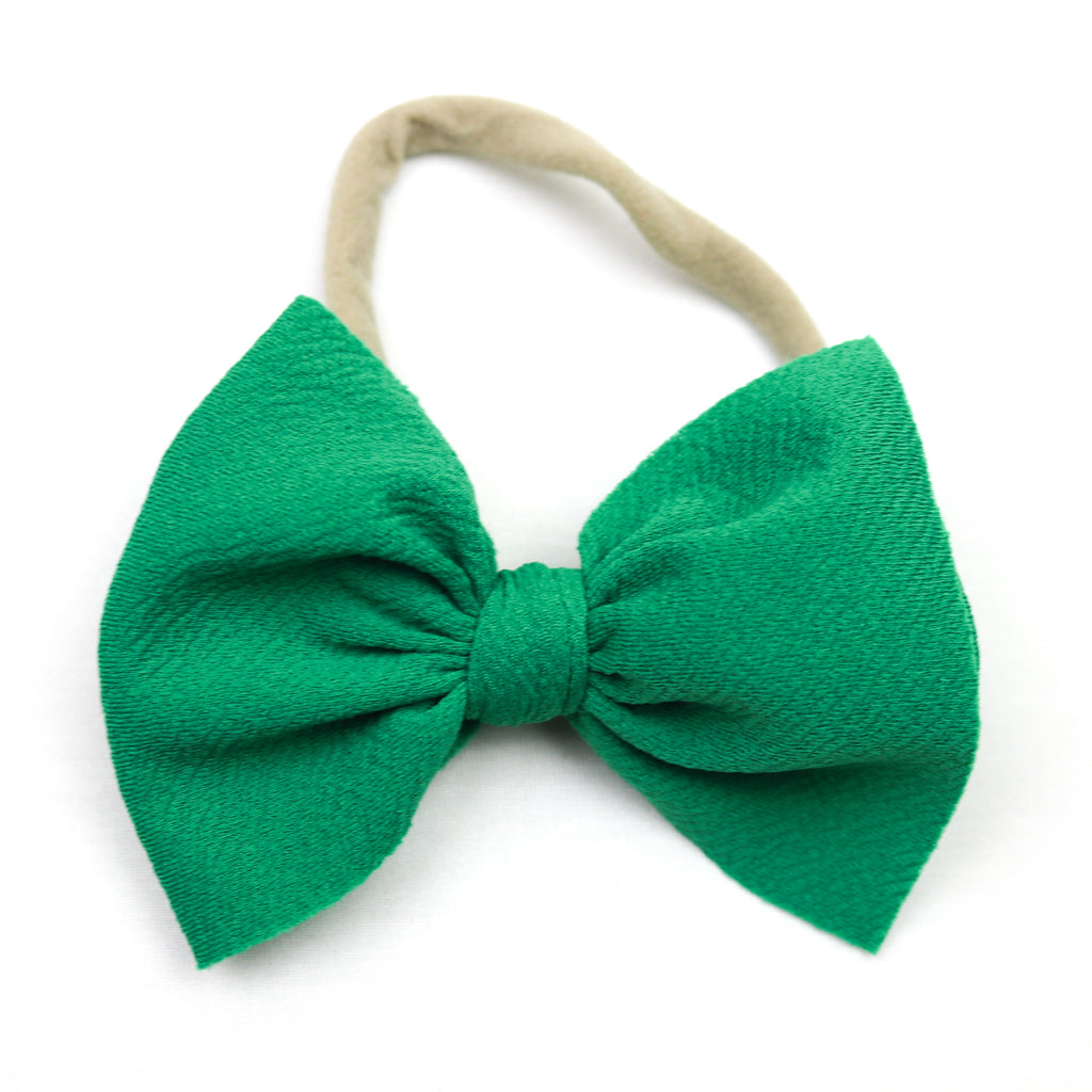 Bow measures approximately 4" in width. One size fits all, nylon has considerable stretch. Suitable for babies of all ages.