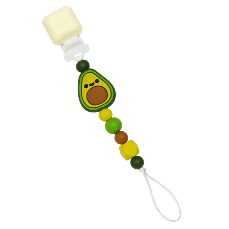 Featuring differently shaped food grade silicone beads, this Avocado baby pacifier clip is an adorable way to keep soothers, teething rings or toys close at hand (and off the floor!). Simply loop baby's pacifier or toy to one end, then use the first-of-its-kind one-piece silicone molded clip to fasten the other end to clothing, blankets, car seats, strollers or diaper bags.