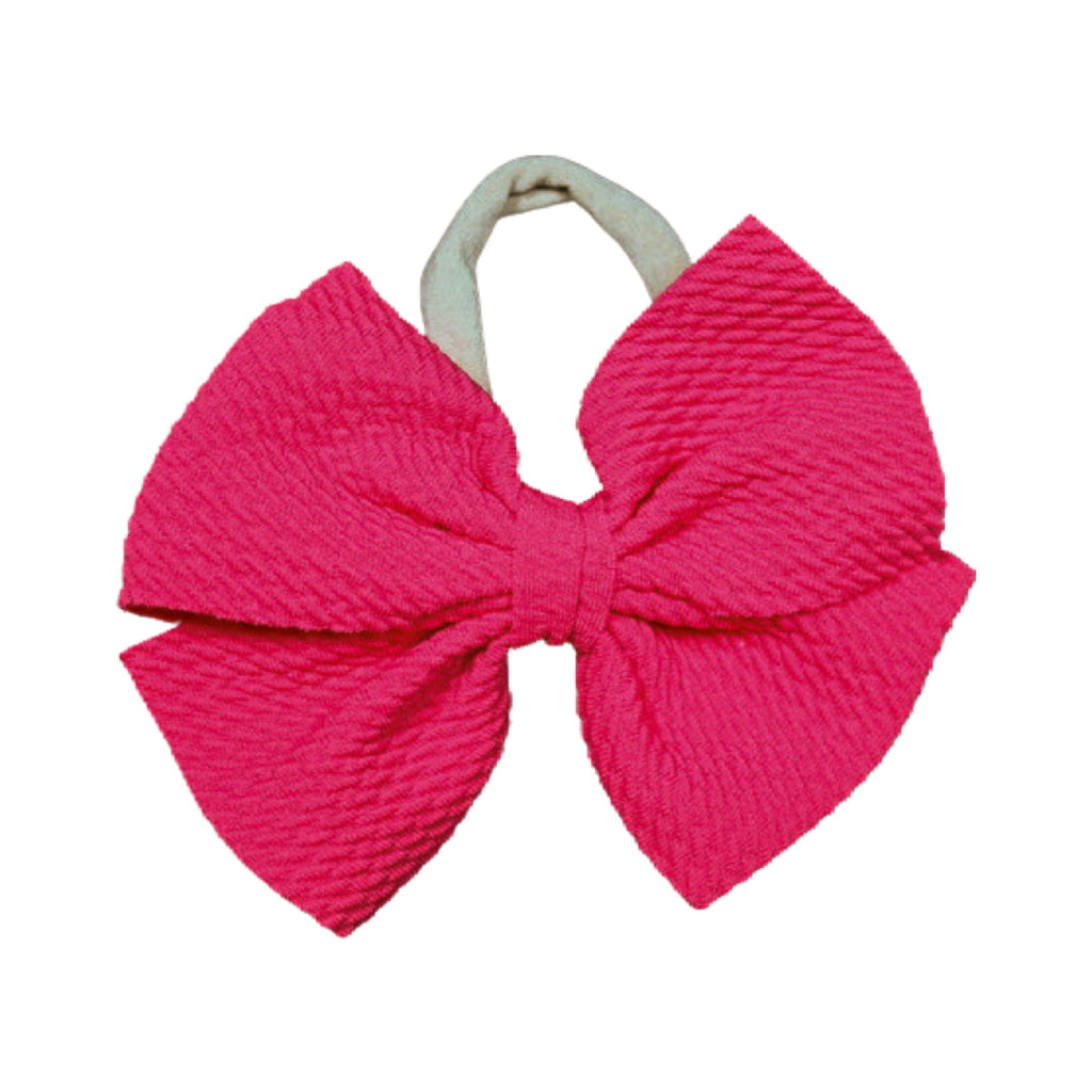 Butterfly-style bow on a nude nylon headband. Bow measures roughly 4" x 3". One size fits all, nylon has considerable stretch. Suitable for babies (and toddlers!) of all ages.