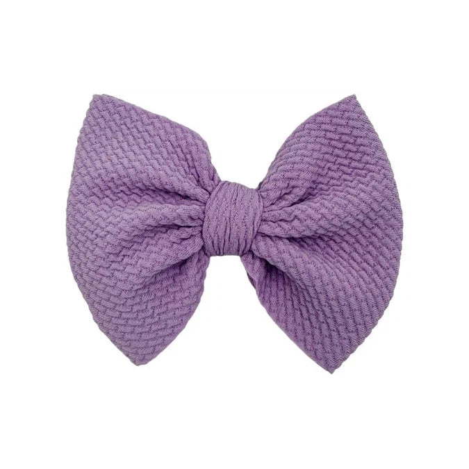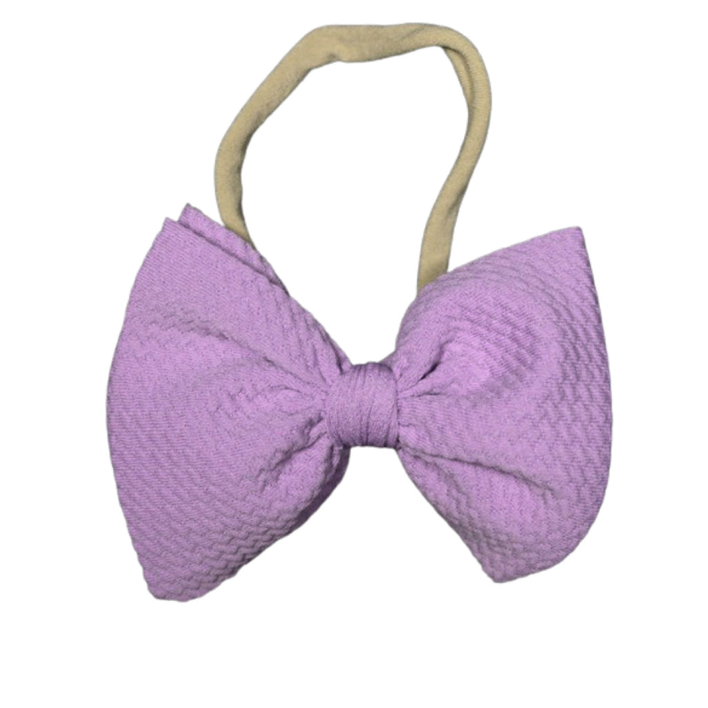 Bow measures approximately 4" in width. One size fits all, nylon has considerable stretch. Suitable for babies of all ages.