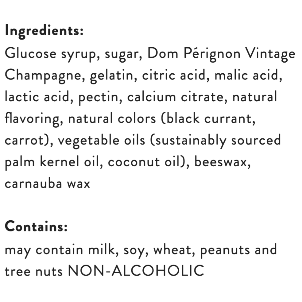 Champagne Bears with a sour twist. These classic Champagne-infused gummy bears are dusted in sweet and tart sugar crystals for a sophisticated taste that really "pops." Made with Dom Pérignon Vintage Champagne. A Sugarfina exclusive. Non-alcoholic.