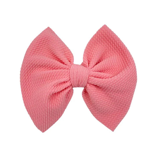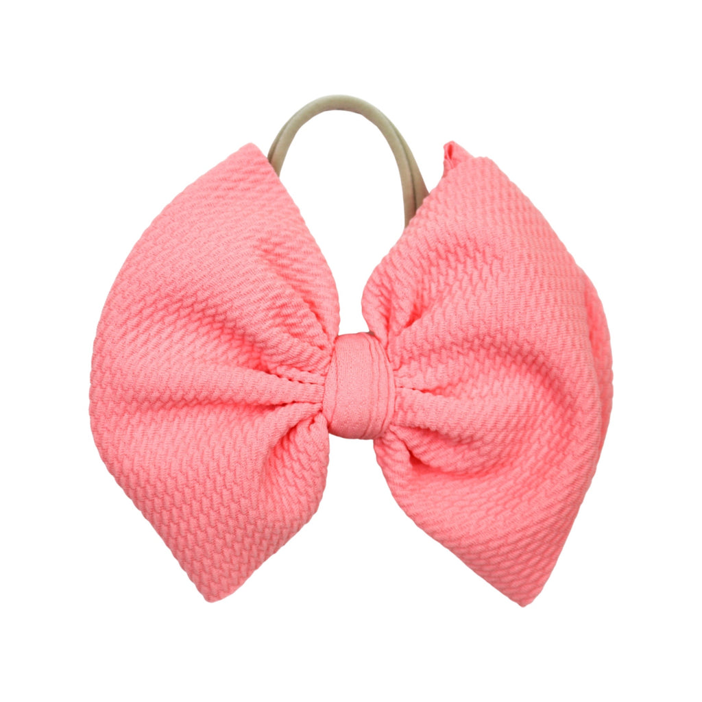 Big bow on nude nylon headband. Bow measures approximately 6" in width. One size fits all, nylon has considerable stretch. Suitable for babies (and toddlers!) of all ages.