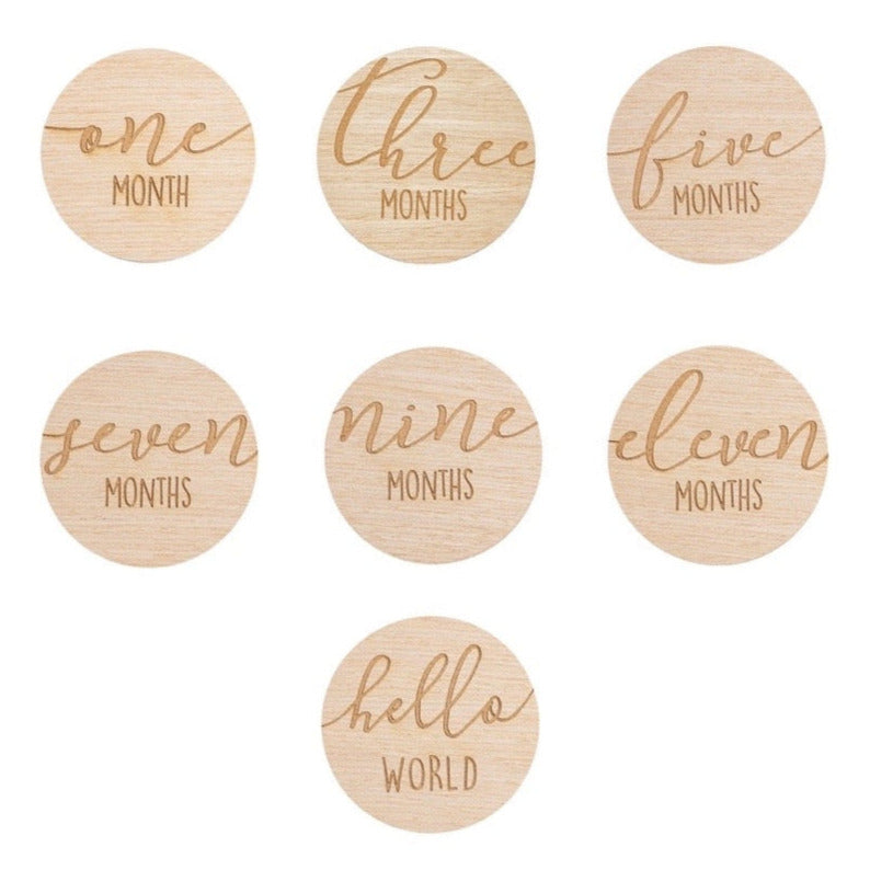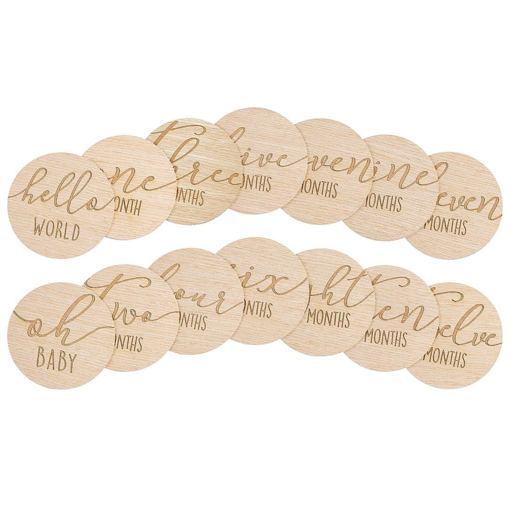 These monthly milestone marker cards are the perfect photo prop to capture pregnancy moments and create baby keepsakes. Milestone photo cards engraved with “one month” to “twelve months,” “hello word” and “oh baby” make it possible to capture each month of your pregnancy along with each month of baby’s first year. The wooden cards are gender-neutral making them perfect for baby girls or baby boys. Get creative and capture photos to share to social media to document mom’s pregnancy journey, baby’s first twelve months, pregnancy announcements and baby birth announcements.