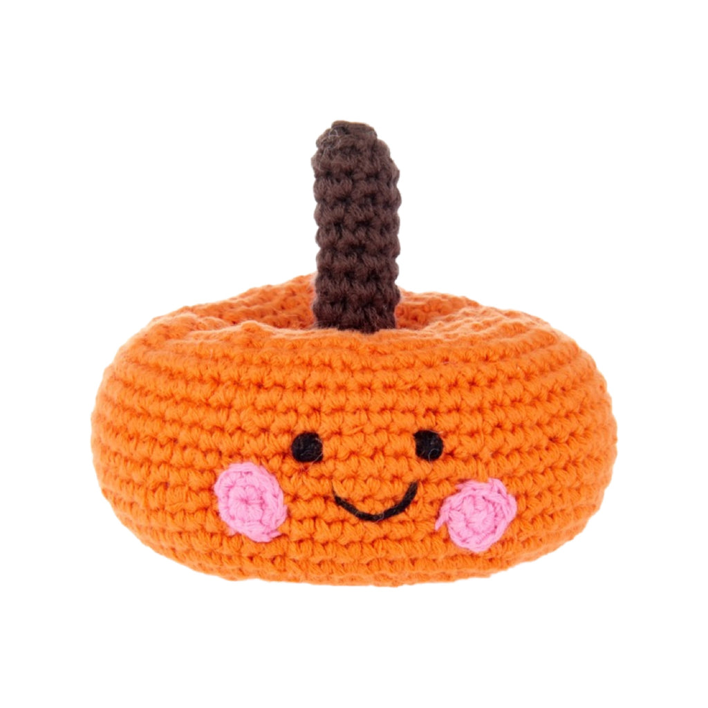- Pumpkin Rattle is made of 100% cotton with 100% polyester fill. Size: 3 inch x 3 inch. Made entirely by hand with natural materials and as such there will be slight variations in size, color and design. All Pebble products are fair-trade certified-- made in Bangladesh by the extremely talented and capable artisans at Hathay Bunano.
