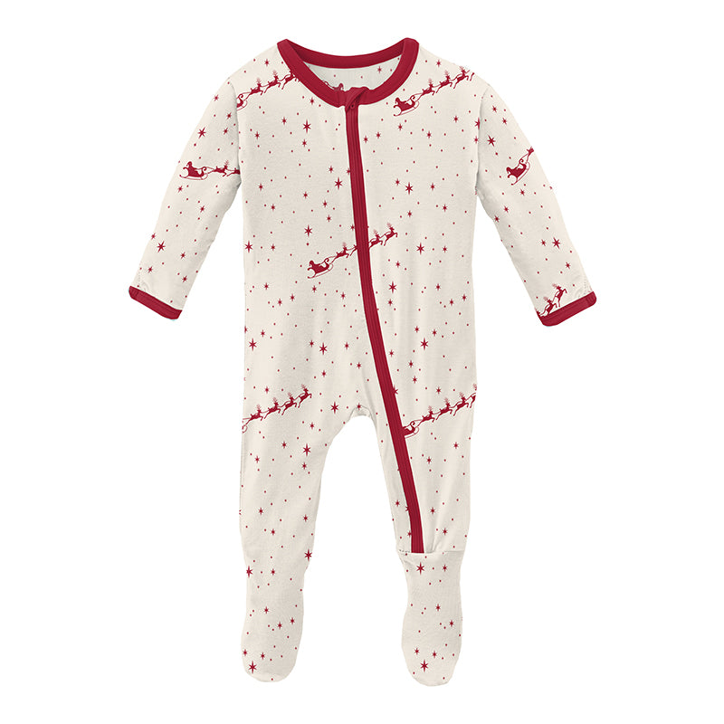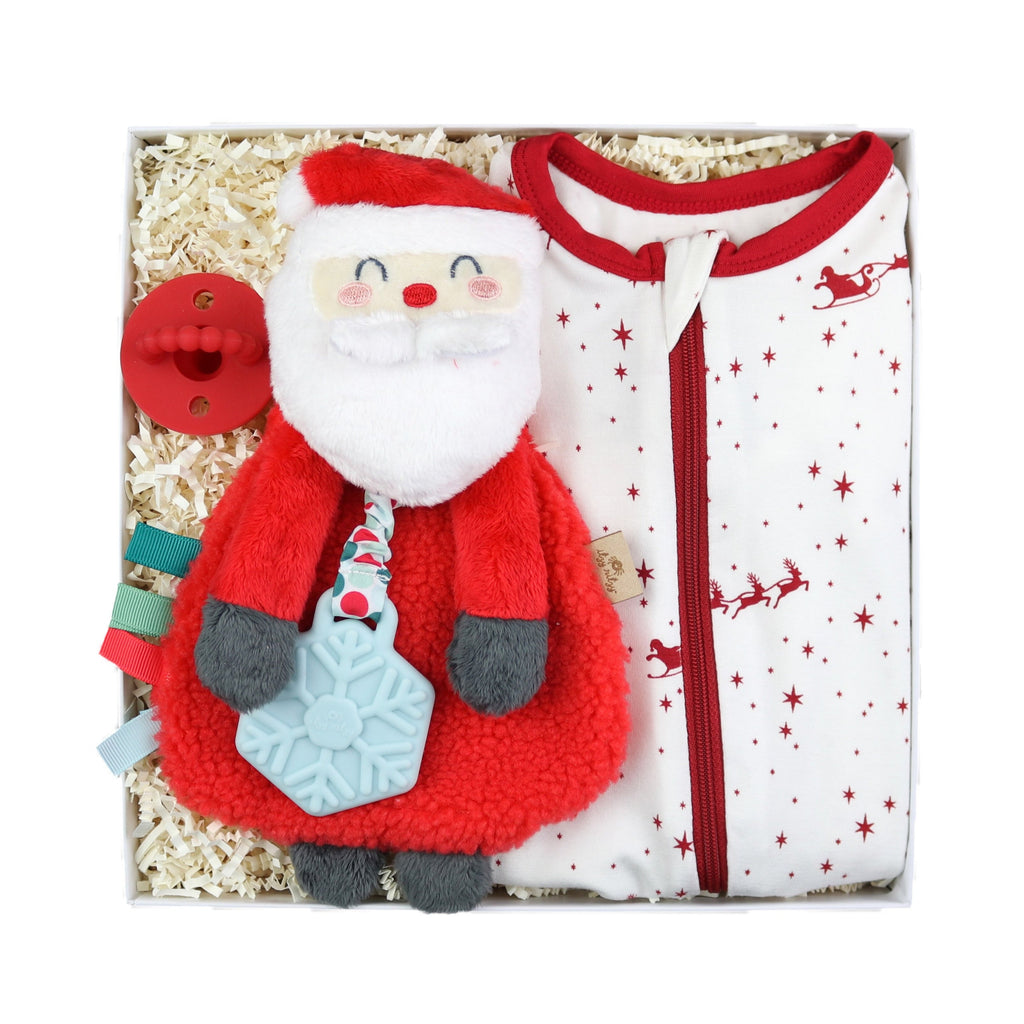 Featuring bamboo zipper footie in Natural Flying Santa by Kickee Pants, Holiday Santa Lovey Plush + Teether Toy by Itzy Ritzy and red Cutie PAT infant pacifier / teether (round, stage 1) by Ryan & Rose.