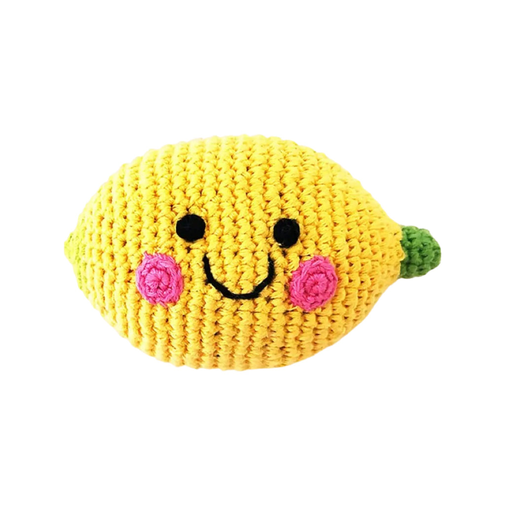 - Rattle is made of 100% cotton with 100% polyester fill. Made entirely by hand with natural materials and as such there will be slight variations in size, color and design in line with the unique nature of this product. All Pebble products are made in Bangladesh by the extremely talented and capable artisans at Hathay Bunano. Guaranteed Fair Trade and certified by the World Fair Trade Organization. Sustainable and Eco-friendly. Size: 5" l x 4" w x 3" h.