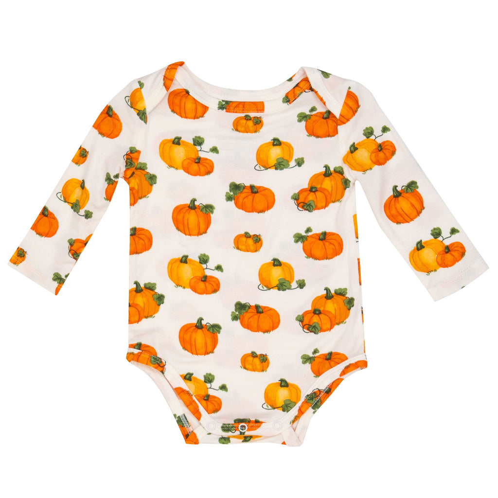 Celebrate a new baby this season with this sweet, fall, pumpkin-themed ensemble! Featuring long sleeve bamboo bodysuit in Pumpkin Patch by Angel Dear, Knit Pumpkin Hat by Blueberry Hill, You're My Little Pumpkin Pie board book by Nicola Edwards. and Friendly Pumpkin Rattle by Pebble.