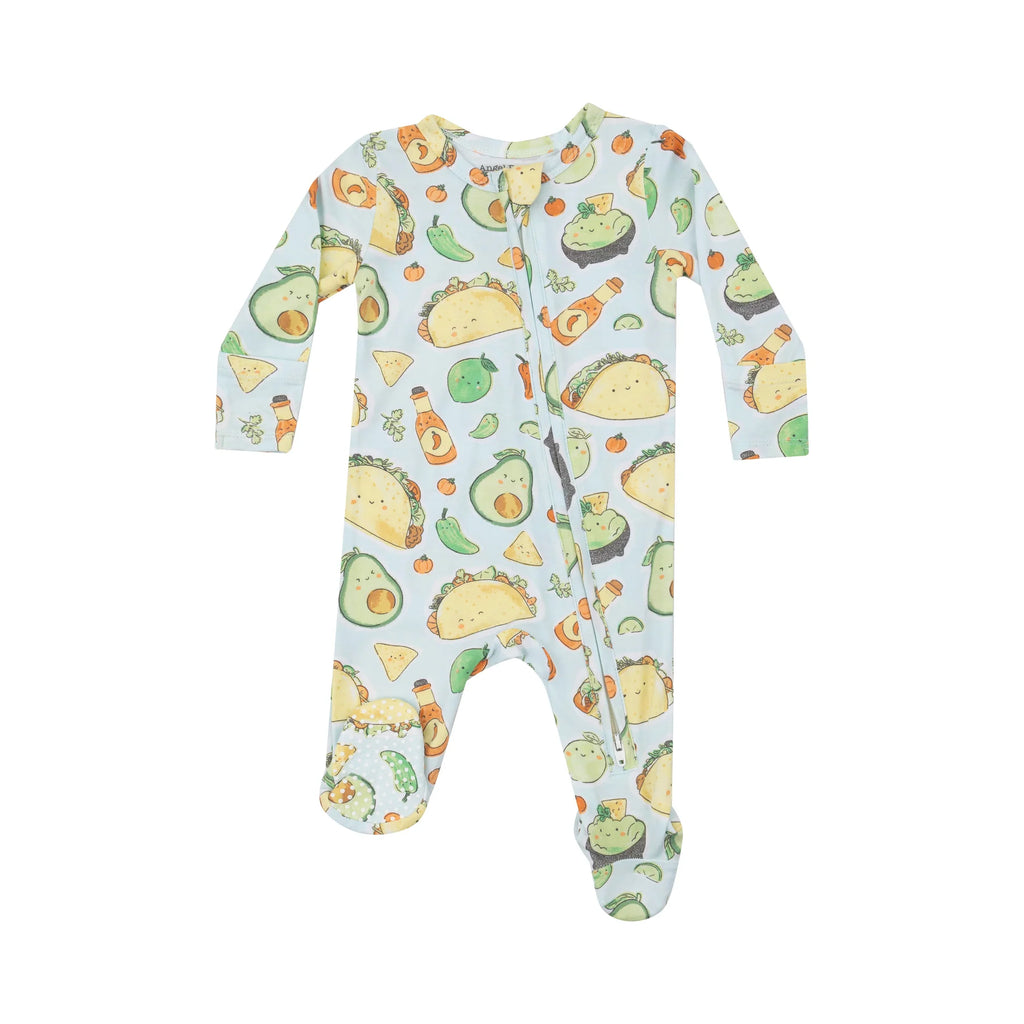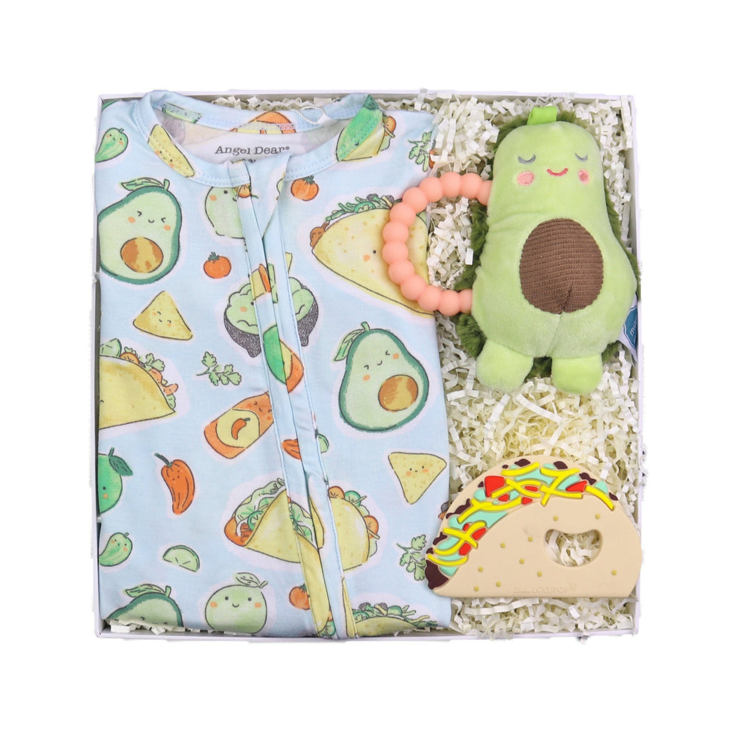 An adorable gender-neutral taco set for your little! Featuring bamboo 2-way zipper footie in Happy Tacos by Angel Dear, Yummy avocado teether rattle by Mary Meyer and Silicone Taco Teether by Loulou Lollipop.
