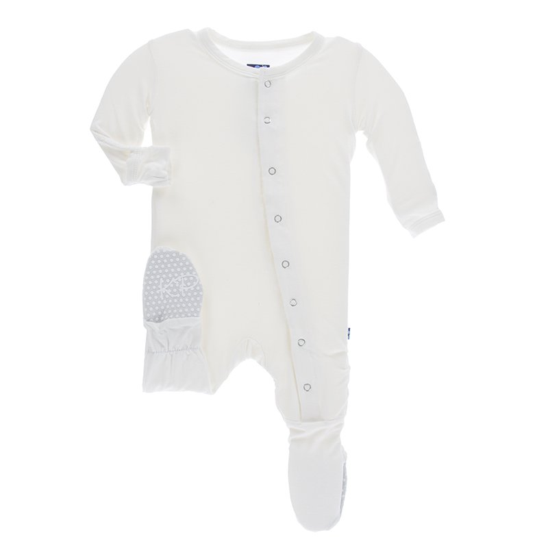 - Footie is made of 95% Viscose from Bamboo, 5% Spandex. Footie features flip paws to cover baby's cold hands and prevent scratching. The inside of each foot is lined with soft fleece and the outside bottom is embroidered to prevent slipping. SPF 50+. KicKee Pants uses only source bamboo that is grown organically from manufacturers that provide Harmful Chemical Free Assurance.