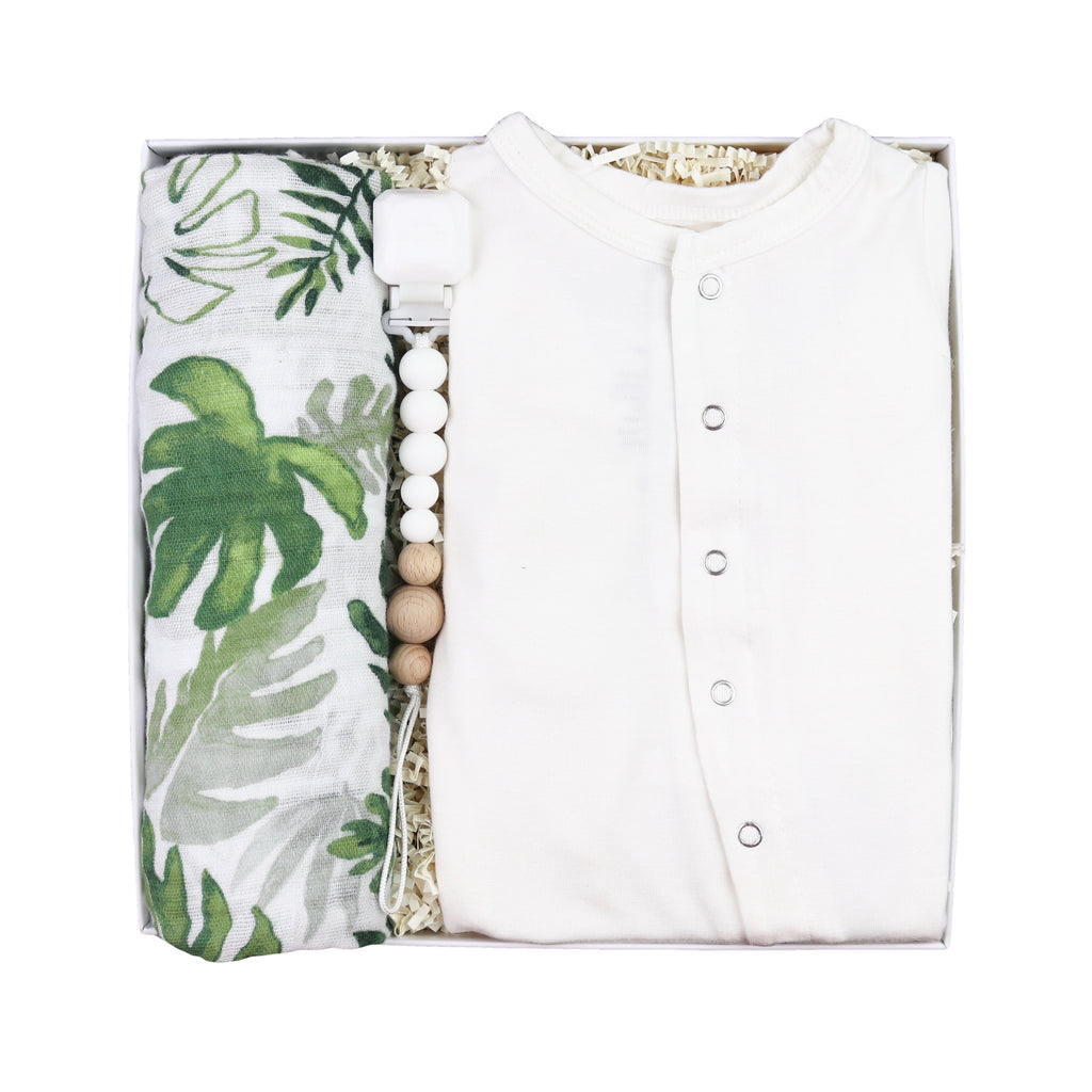 A classic homecoming or newborn photo baby gift set with soft white colors and gender neutral accents in a classic swaddle print. Featuring footie with snaps in Natural by Kickee Pants, cotton muslin swaddle blanket in Tropical Leaf by Little Unicorn and silicone colour pop pacifier clip in Snow White by Loulou Lollipop.