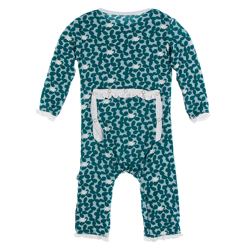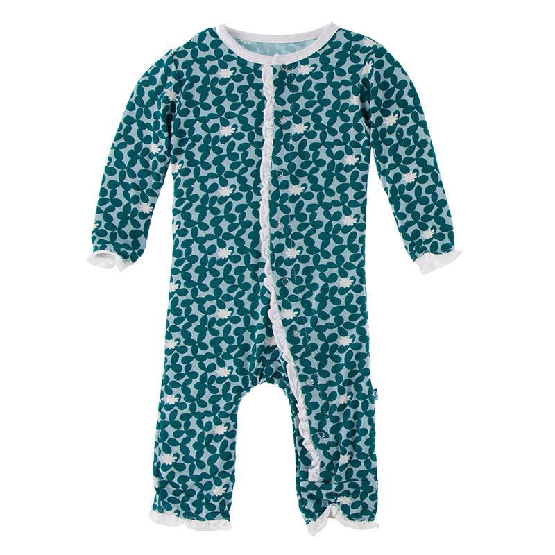 Coverall is made of 95% Viscose from Bamboo, 5% Spandex.  Coverall features ruffles on the butt and down the front for an extra feminine look. SPF 50+. KicKee Pants uses only source bamboo that is grown organically from manufacturers that provide Harmful Chemical Free Assurance.