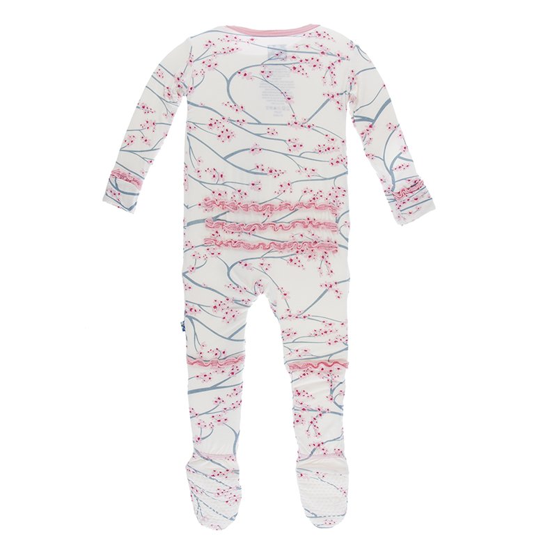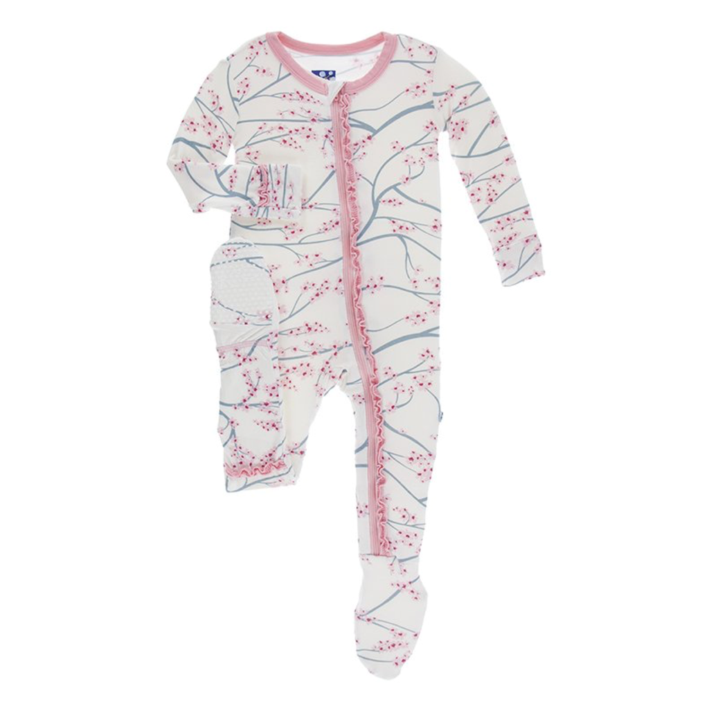 Muffin ruffle footie with zipper in Natural Japanese Cherry Tree by Kickee Pants.