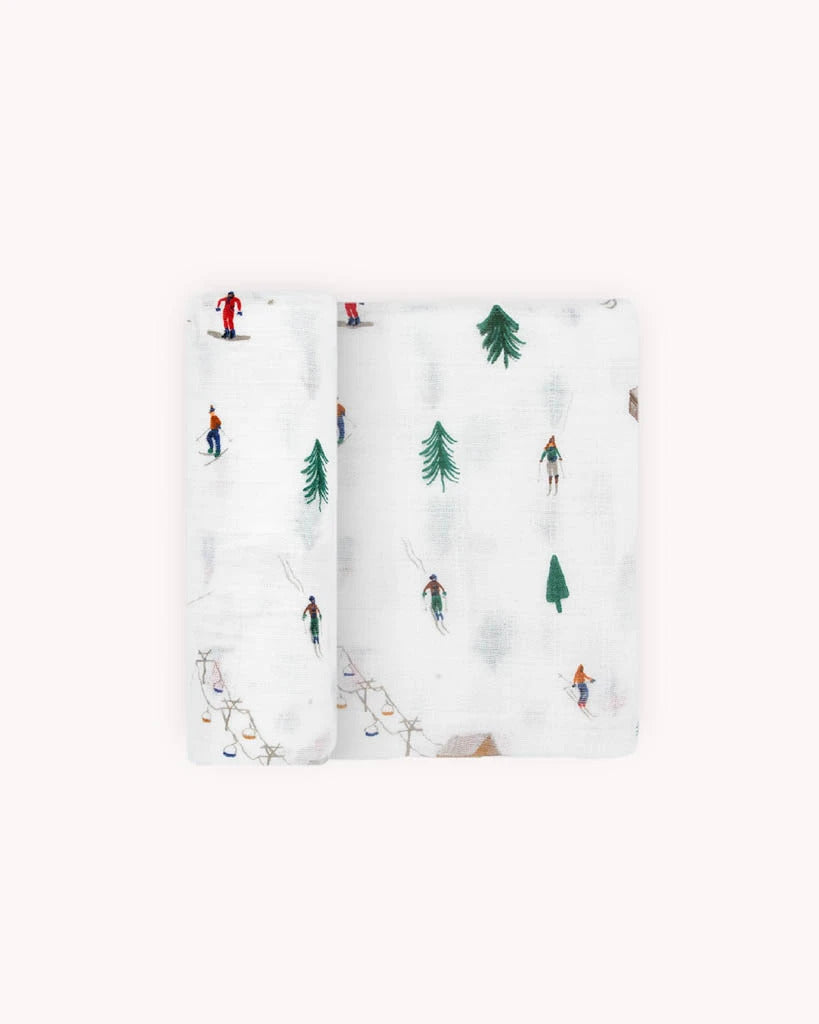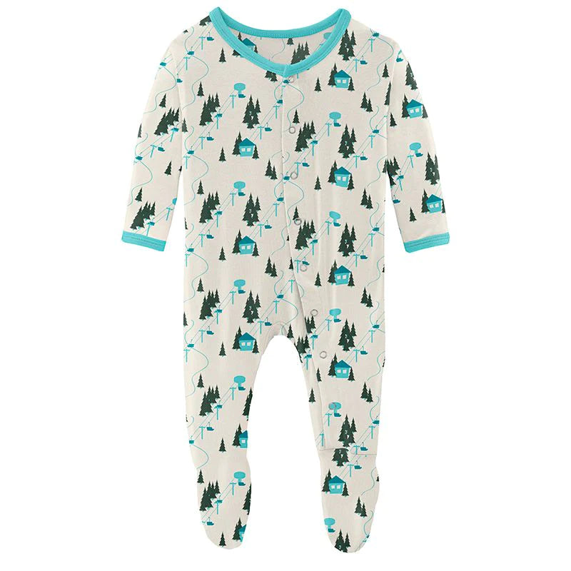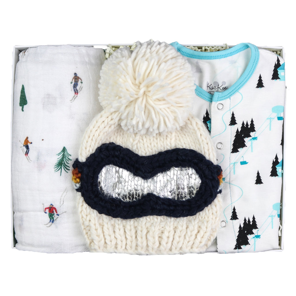 Featuring bamboo zipper footie in Natural Chairlift by Kickee Pants, Ski Goggles Beanie Hat in Retro by Blueberry Hill and cotton muslin swaddle blanket in Powder Party (featuring skiing and snowboarding!) by Little Unicorn.