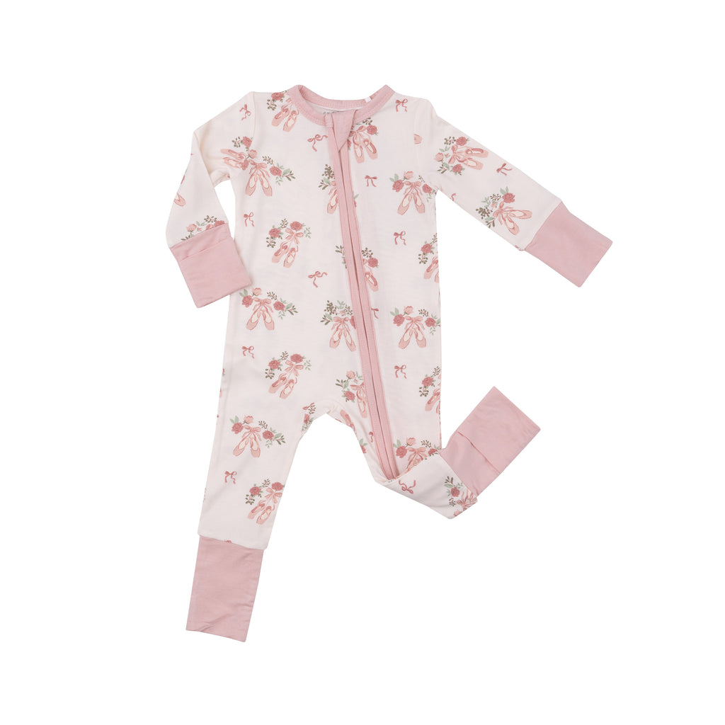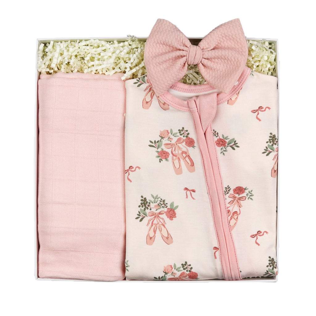 Featuring Ballet Shoes bamboo zipper romper by Angel Dear, deluxe muslin swaddle blanket in Blush by Little Unicorn, and skinny bow on nude nylon in Peony by Little Lopers.