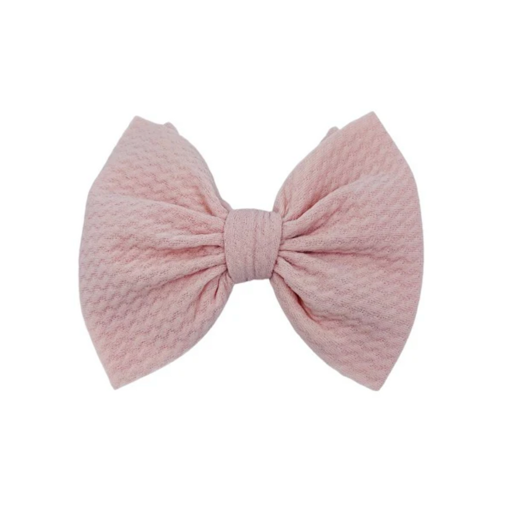 - Bow is one-size-fits-all from newborn to toddler. 4” bow on stretchy nude nylon headband.