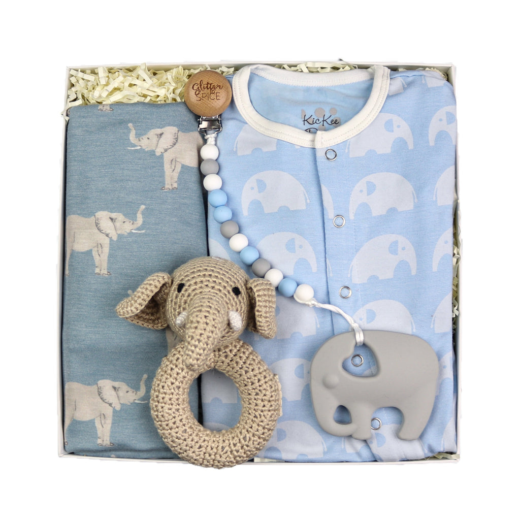 The blue elephant baby gift box is the perfect gift for a mom-to-be expecting a sweet baby boy! Featuring bamboo footie with zipper in Pond Elephant by Kickee Pants, knit swaddle blanket in Peanut by Copper Pearl, Elephant ring rattle by Cheengoo, and Elephant Teether with clip in Noah Blue by Glitter & Spice, these elephant baby gifts and clothes are a great baby welcoming gift or baby shower idea.