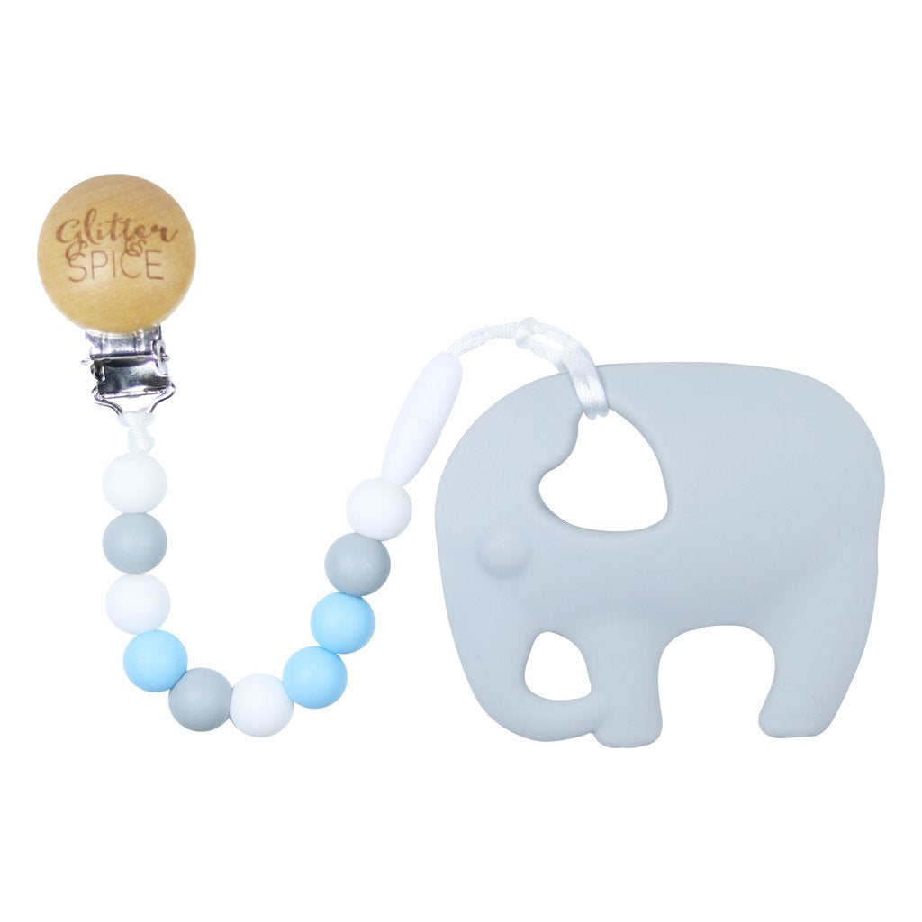 - Elephant Teether with attached clip is made from 100% food-grade silicone, making it free of harmful chemicals. Perfect for little hands and mouths, and textured on both sides to provide maximum relief for your little one's sore teething gums. Bright and playful design and color is sure to engage baby while providing much needed relief during the tough teething period.