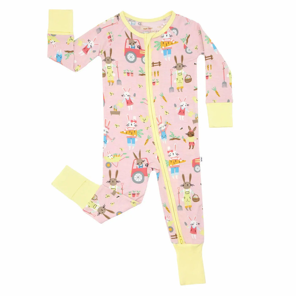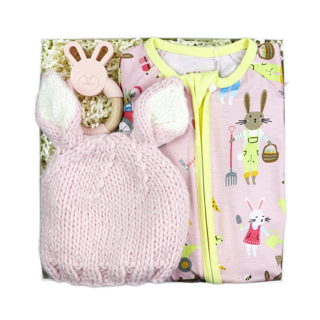Featuring Bamboo Zip Romper/Sleeper in Petal Hop to it by Little Sleepies, Blush Pink Bunny Hat by Huggalugs and Wooden Bunny Teether in Blush by Loulou Lollipop