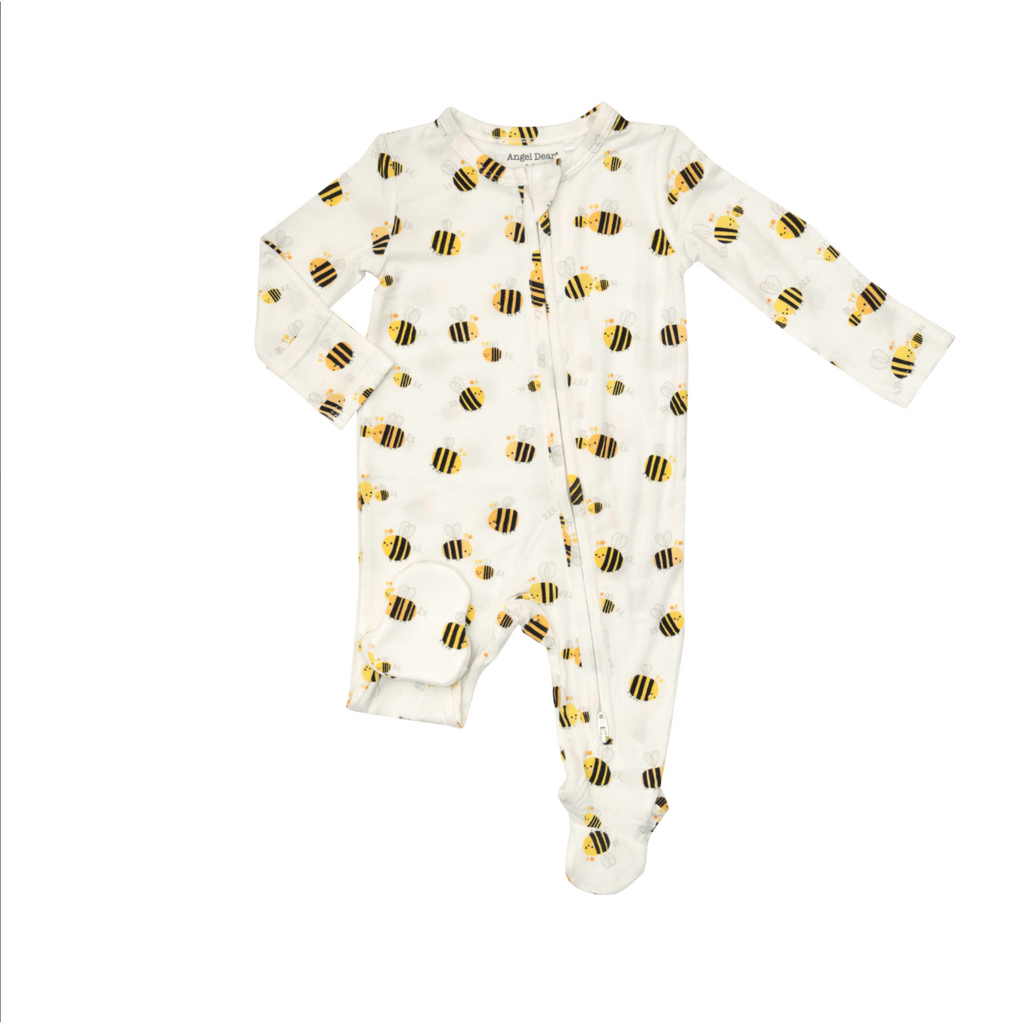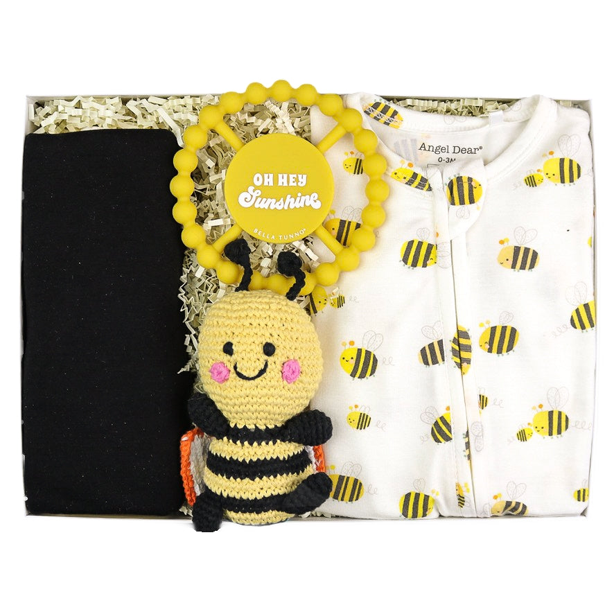 Featuring bamboo 2-way zipper footie in Chubby Bees by Angel Dear, knit swaddle blanket in Midnight (black) by Copper Pearl, Friendly Bumble Bee Rattle by Pebble and Oh Hey Sunshine - Silicone Teether by Bella Tunno.