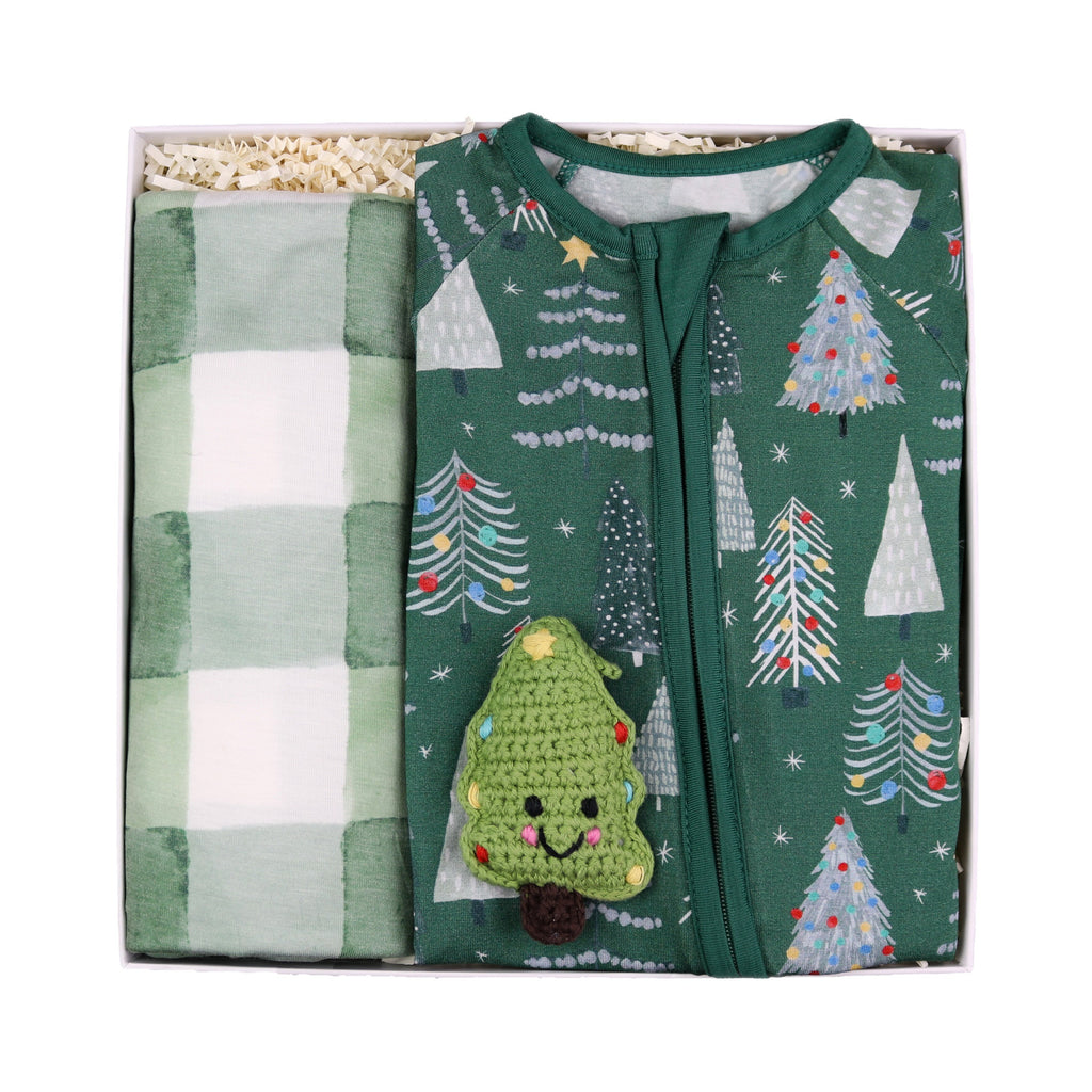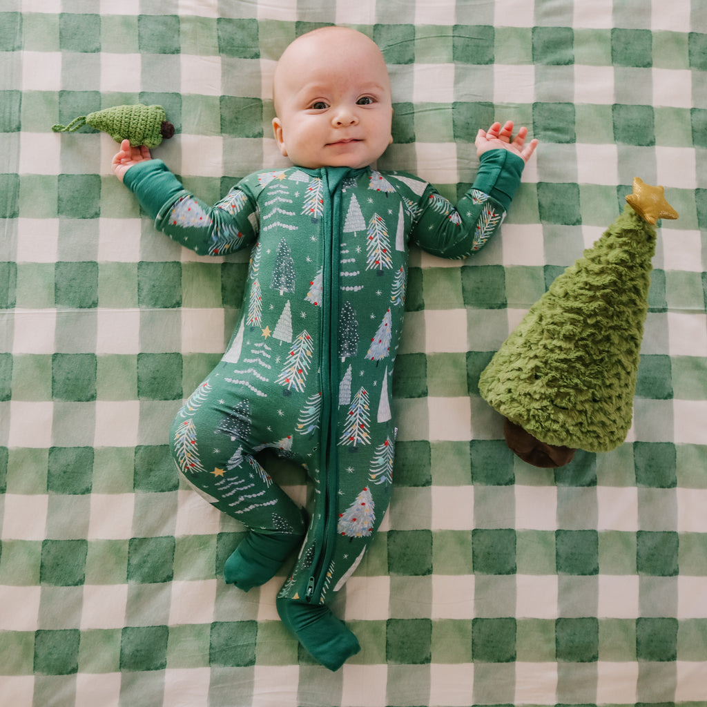 Featuring bamboo viscose zippy sleeper in Green Twinkling Trees by Little Sleepies, premium knit swaddle blanket in Pine by Copper Pearl, and crocheted Christmas tree ornament by Pebble.