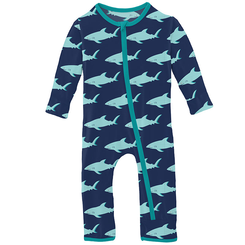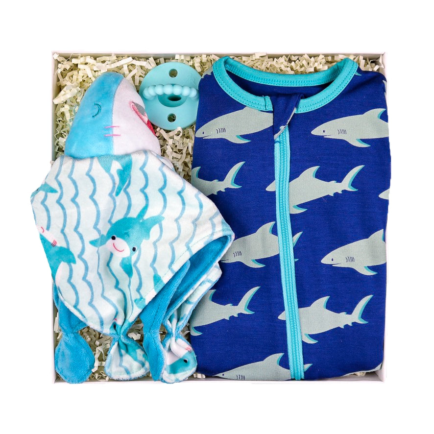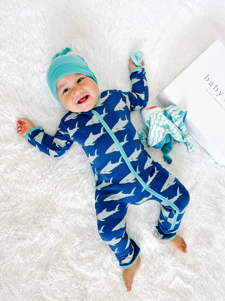 Featuring bamboo zipper coverall in Flag Blue Sharky by Kickee Pants, Sweet Soothie Shark Blanket / lovey by Mary Meyer and Cutie PAT Flat Pacifier / Teether in Coastal by Ryan & Rose.