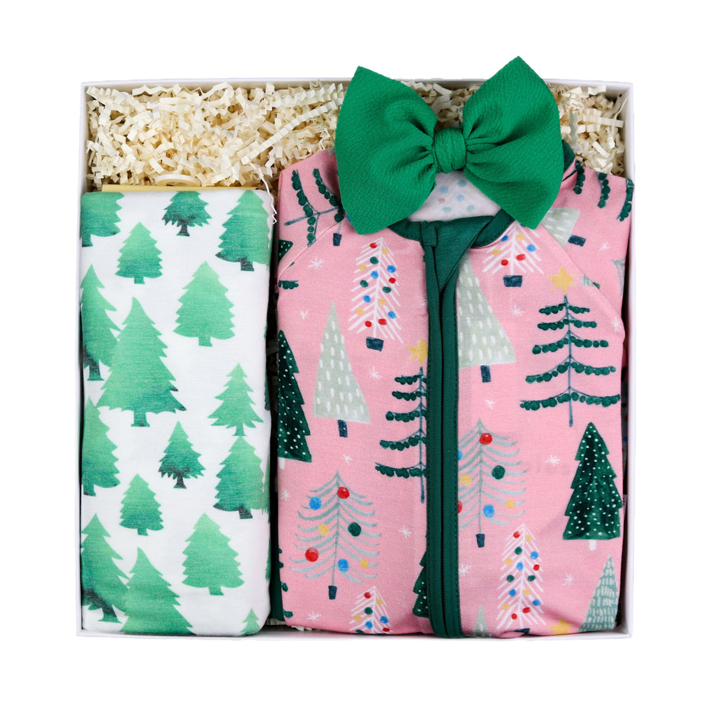 Featuring bamboo viscose zippy sleeper in Pink Twinkling Trees by Little Sleepies, premium knit swaddle blanket in Forest by Copper Pearl, and skinny bow on nude nylon in Holly by Little Lopers.