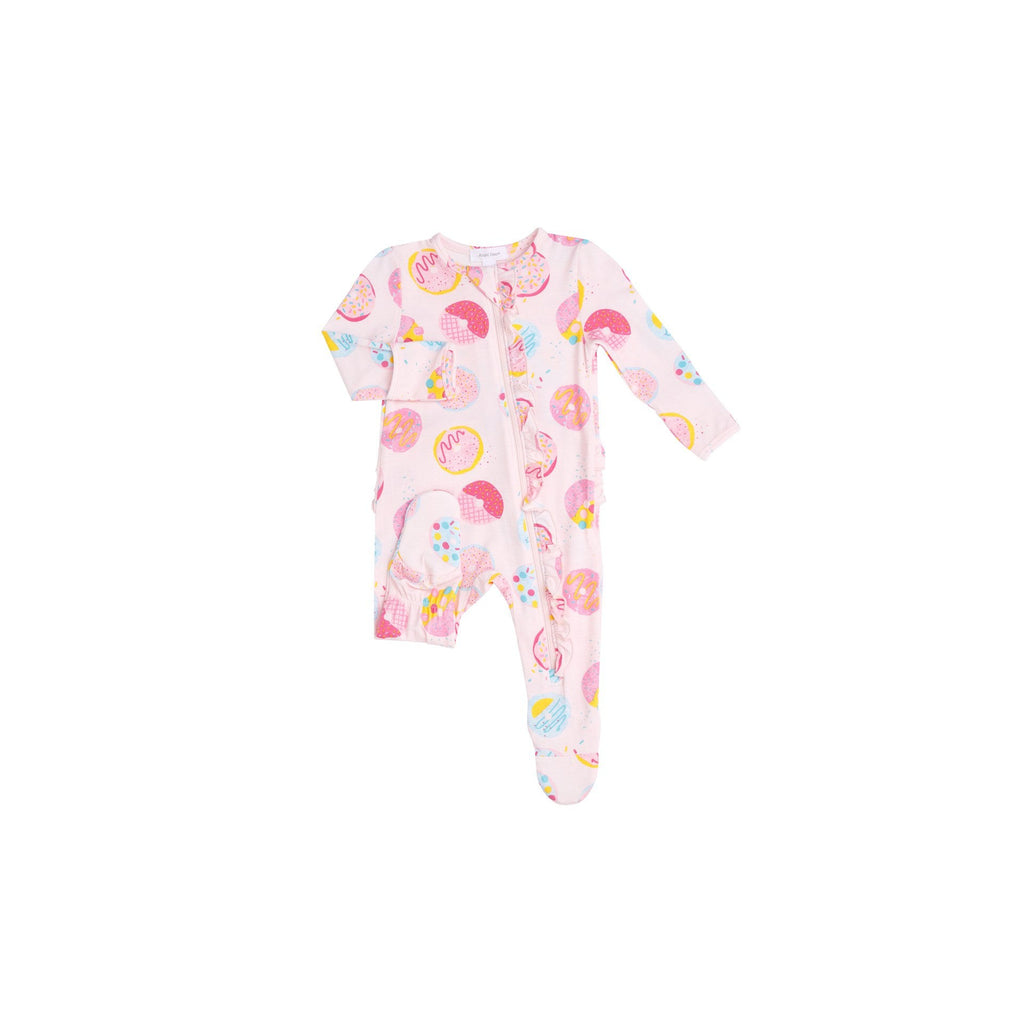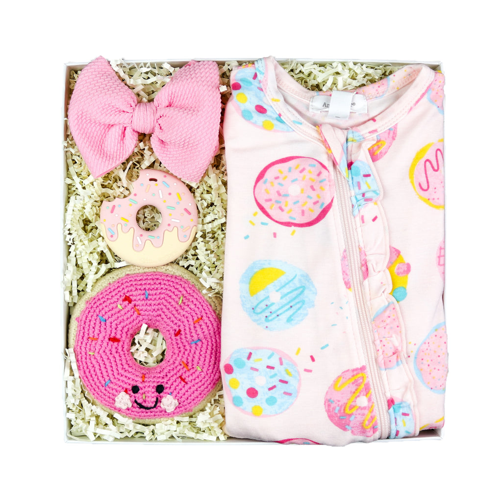Featuring bamboo ruffle footie in Pink Donuts by Angel Dear, Silicone Donut Teether in Strawberry Cream by Glitter & Spice, Friendly Donut Rattle in Pink by Pebble and Pink Skinny Bow on nude nylon by Little Lopers.