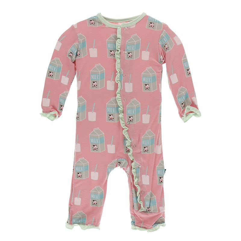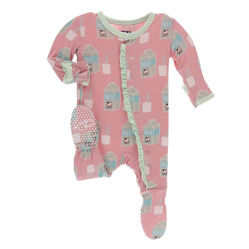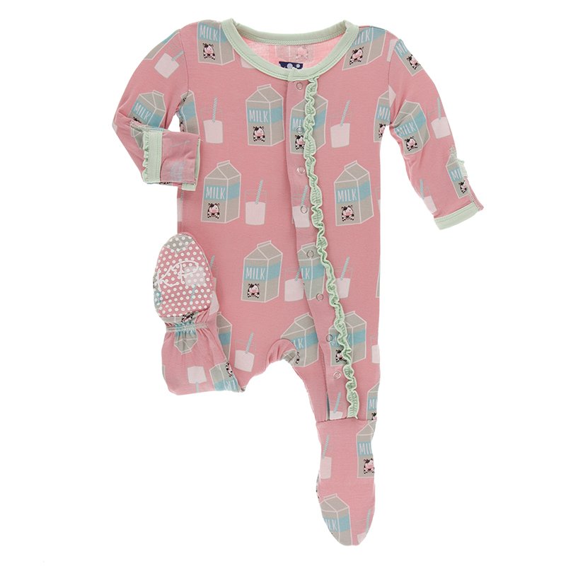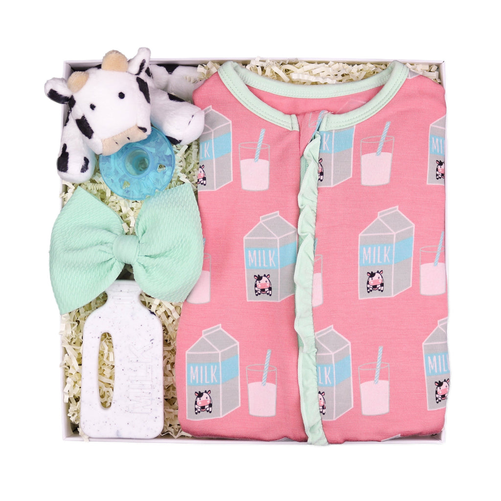 Featuring your choice of bamboo ruffle footie or coverall in Strawberry Milk by Kickee Pants, Cow plush pacifier by Wubbanub, Speckled Milk Teether by Glitter & Spice and skinny bow on nude nylon in Seafoam by Little Lopers.