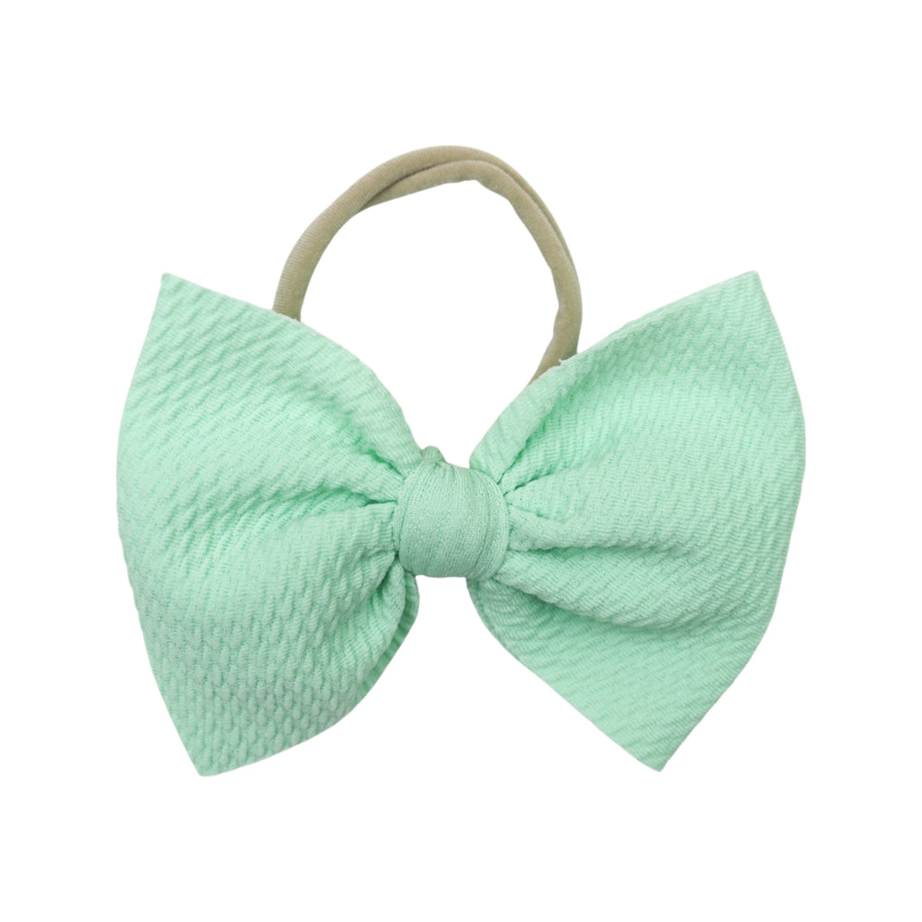 - Bow is one-size-fits-all from newborn to toddler. 4” bow on stretchy nude nylon headband.