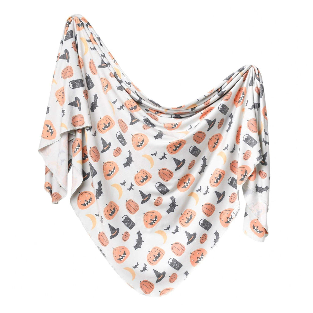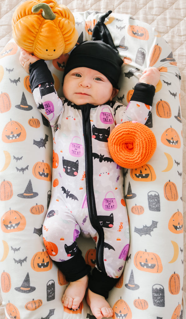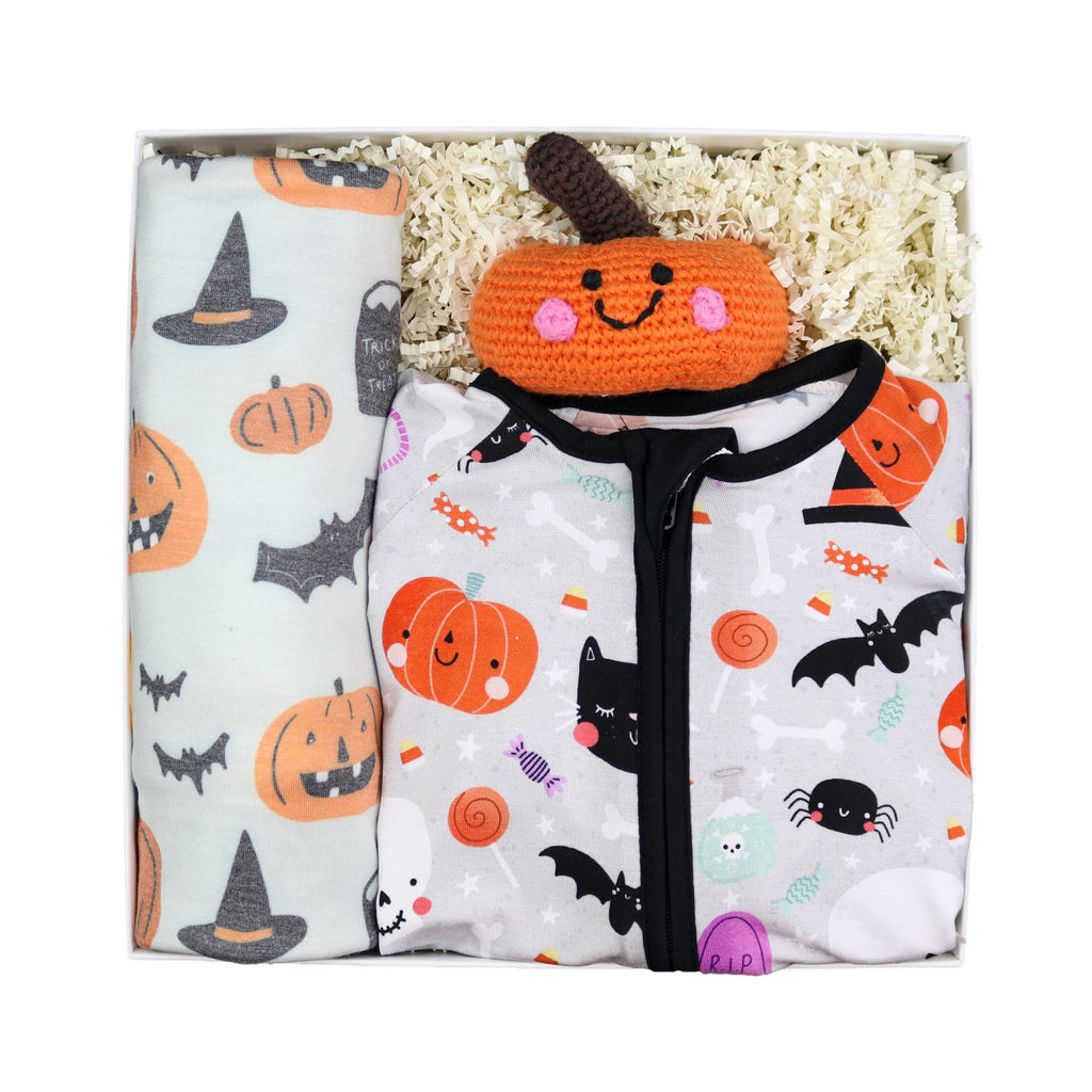 Featuring Trick or Treat Bamboo Viscose Zippy / Sleeper by Little Sleepies, knit swaddle blanket in Trick by Copper Pearl and Friendly Pumpkin Rattle by Pebble.