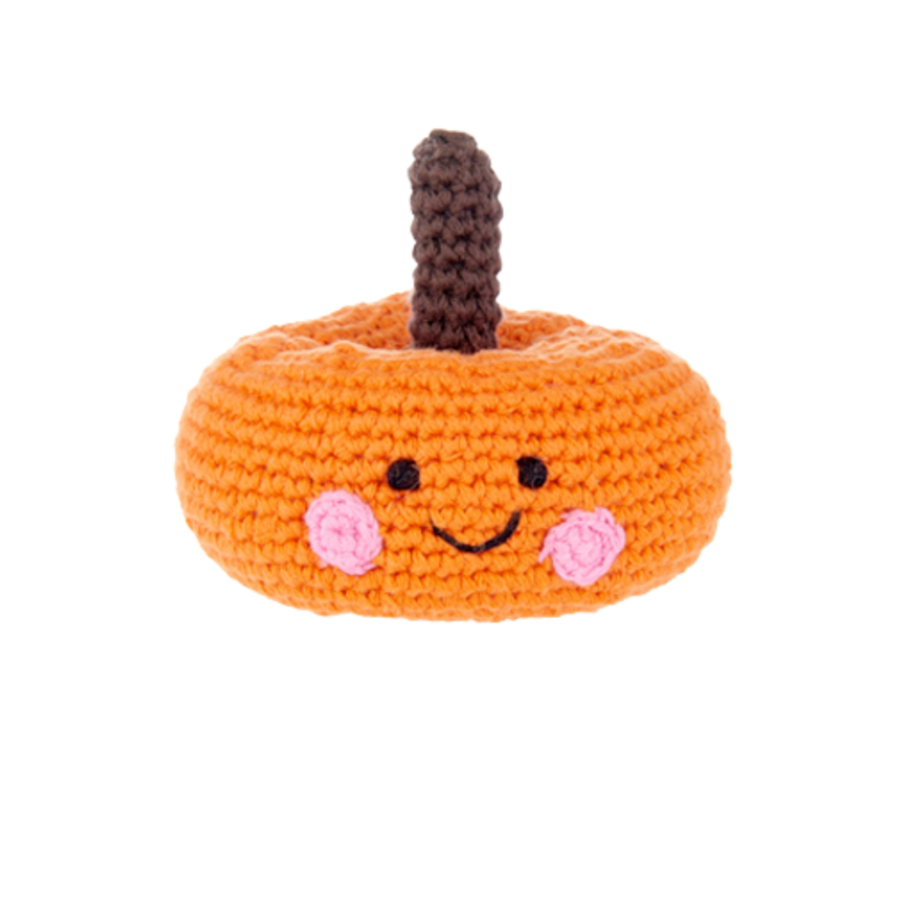 - Pumpkin Rattle is made of 100% cotton with 100% polyester fill. Size: 3 inch x 3 inch. Made entirely by hand with natural materials and as such there will be slight variations in size, color and design in line with the unique nature of this product. All Pebble products are fair-trade certified-- made in Bangladesh by the extremely talented and capable artisans at Hathay Bunano.