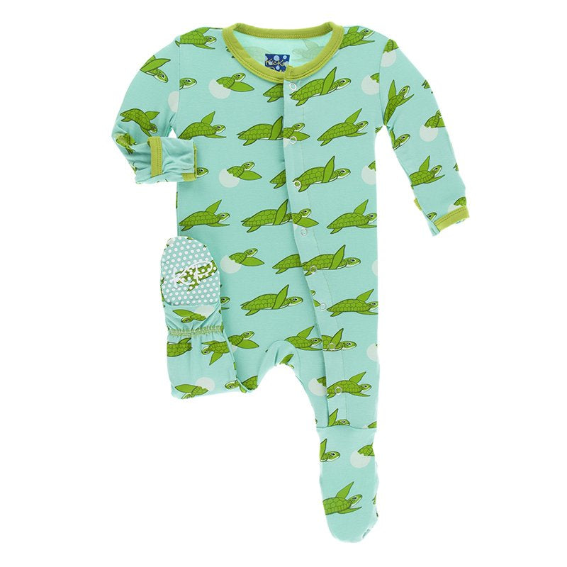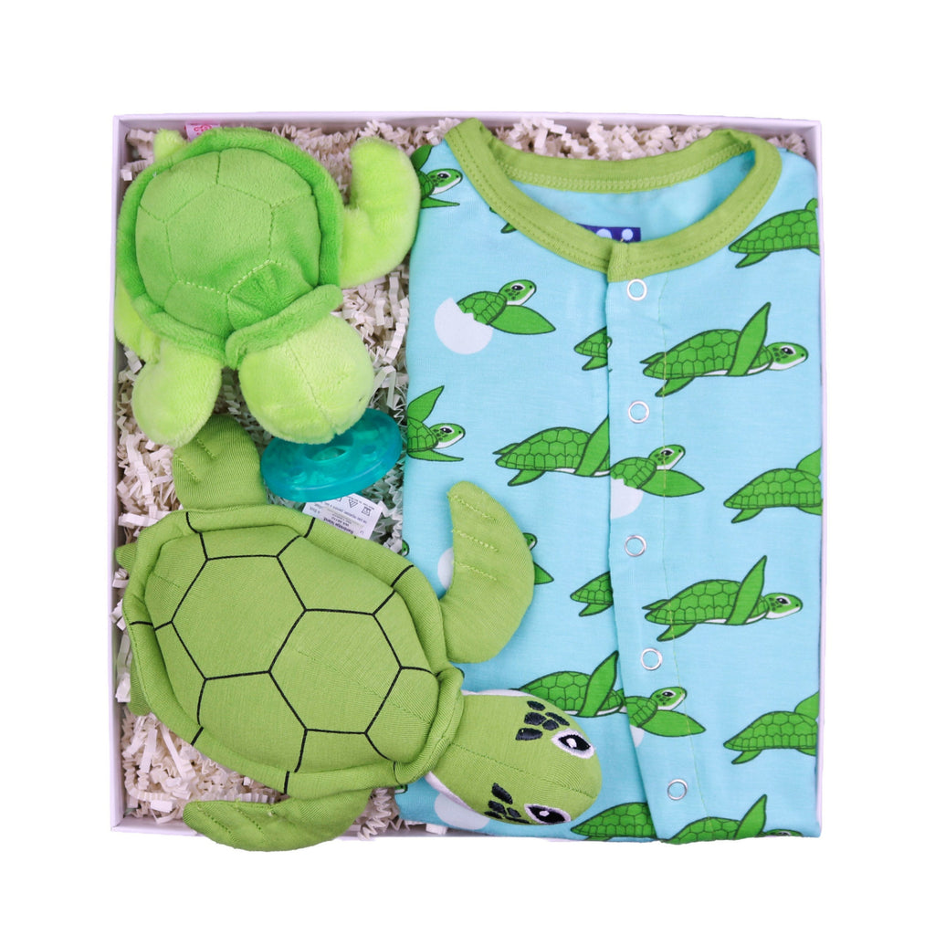 The perfect gender-neutral gift-- this Turtle Baby Boxy looks adorable on a baby boy or baby girl! Use our add-on feature to add a coordinating bow or hat! Our turtle baby gift features bamboo footie with snaps in Glass Sea Turtles by Kickee Pants, Turtle Plush Pacifier by Wubbanub and plush Sea Turtle toy.