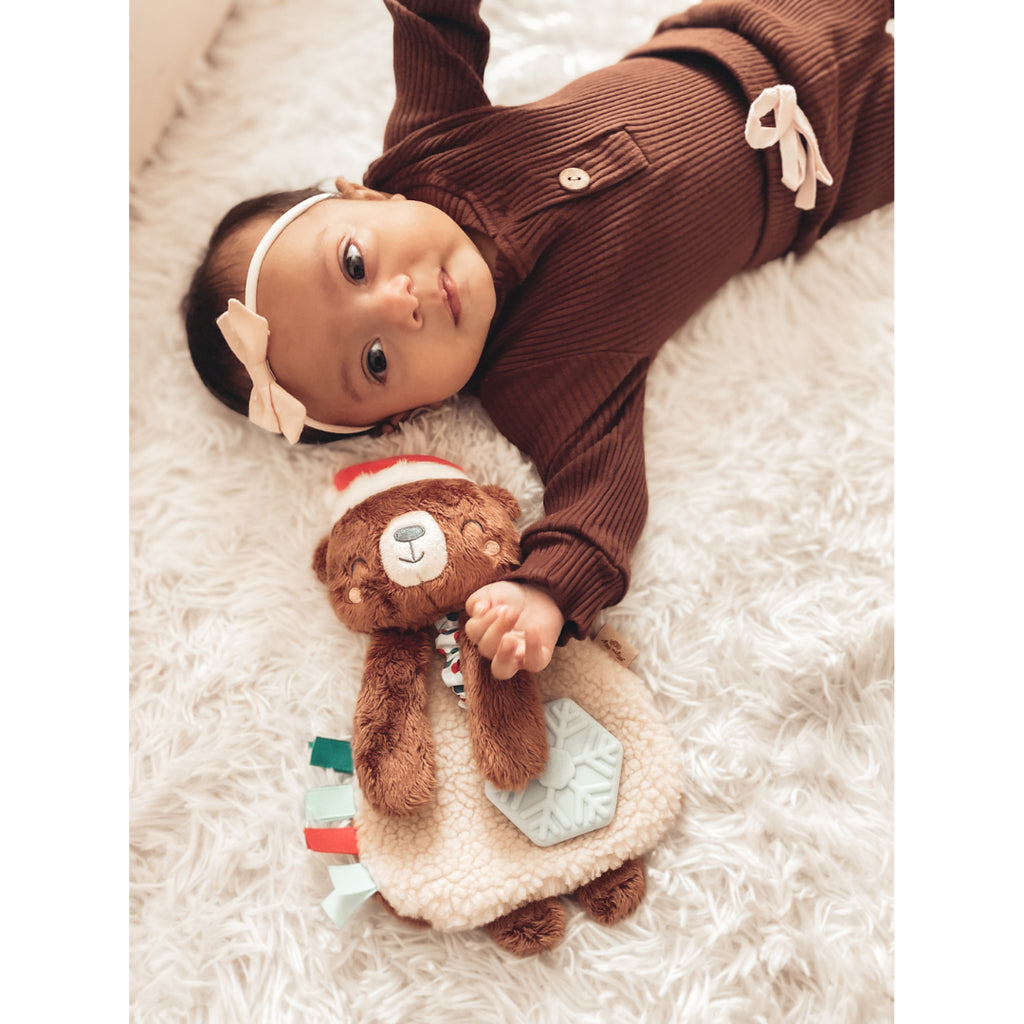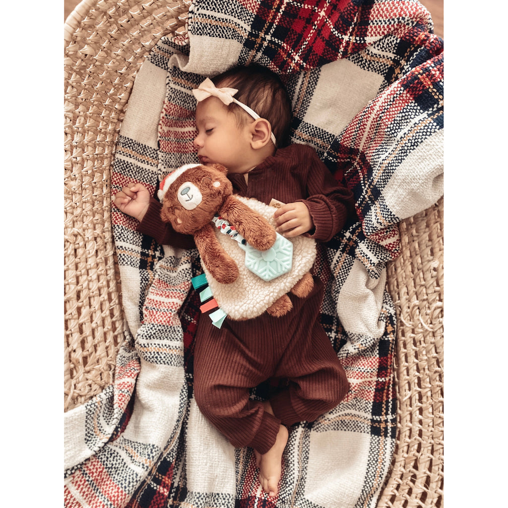 This snuggly Itzy Lovey™ features soft sherpa fabric and textured ribbons that baby will love to explore! A textured silicone teether helps massage and soothe sore gums, and crinkly arms are sure to keep baby entertained with their gentle sound! For ages 0m+.