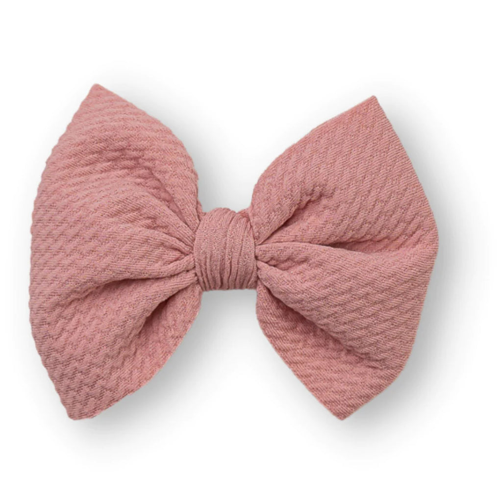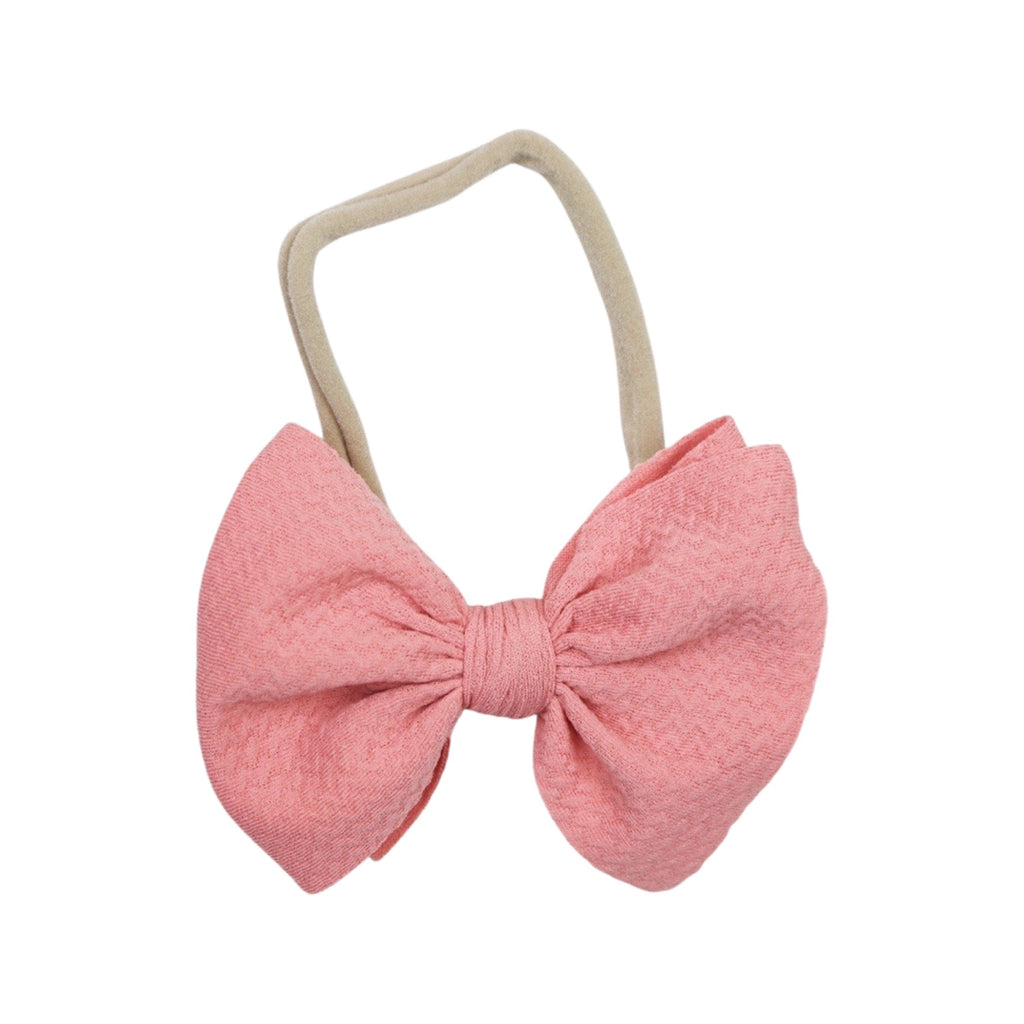 Bow measures approximately 4" in width. One size fits all, nylon has considerable stretch. Suitable for babies of all ages.