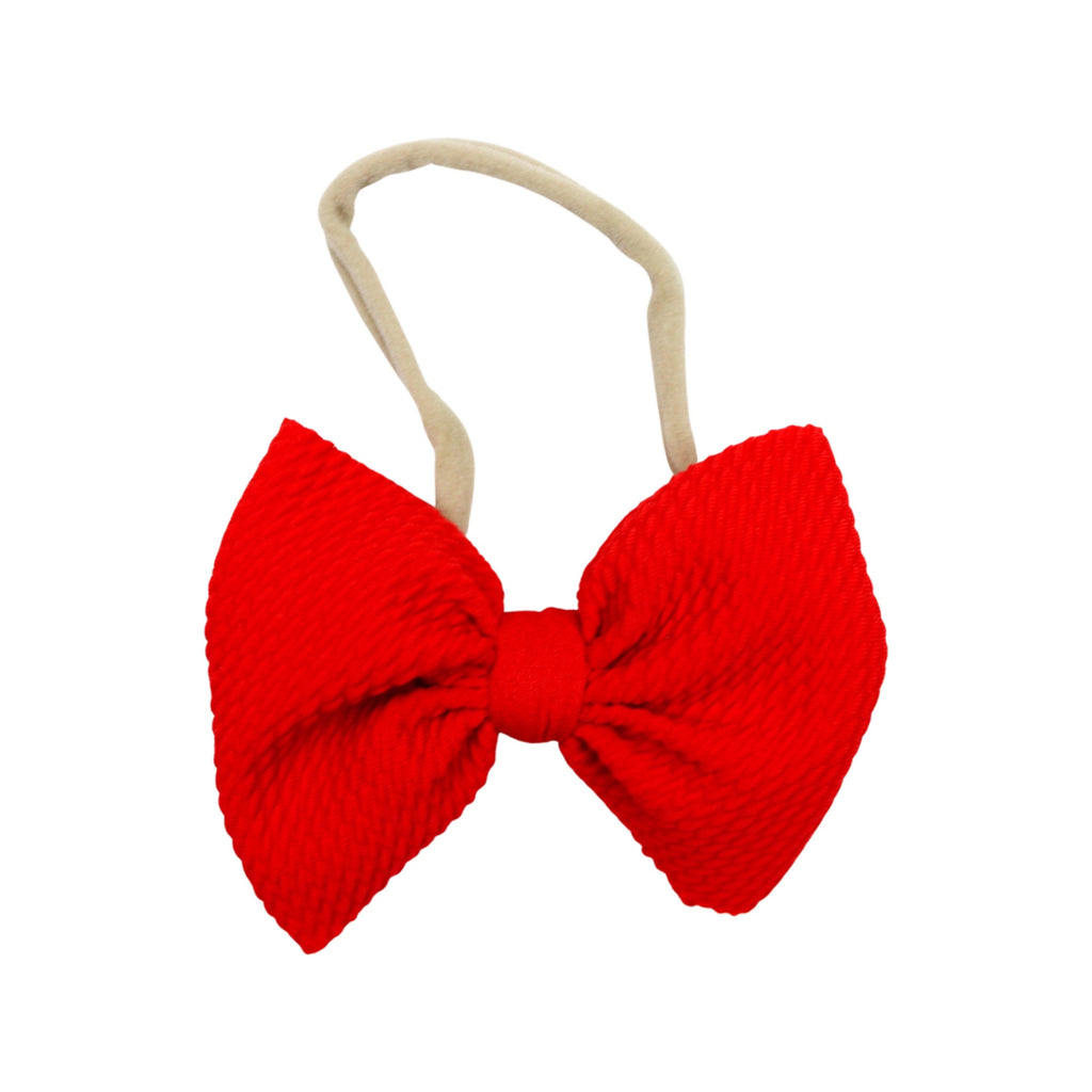 Bow measures approximately 4" in width. One size fits all, nylon has considerable stretch. Suitable for babies of all ages.